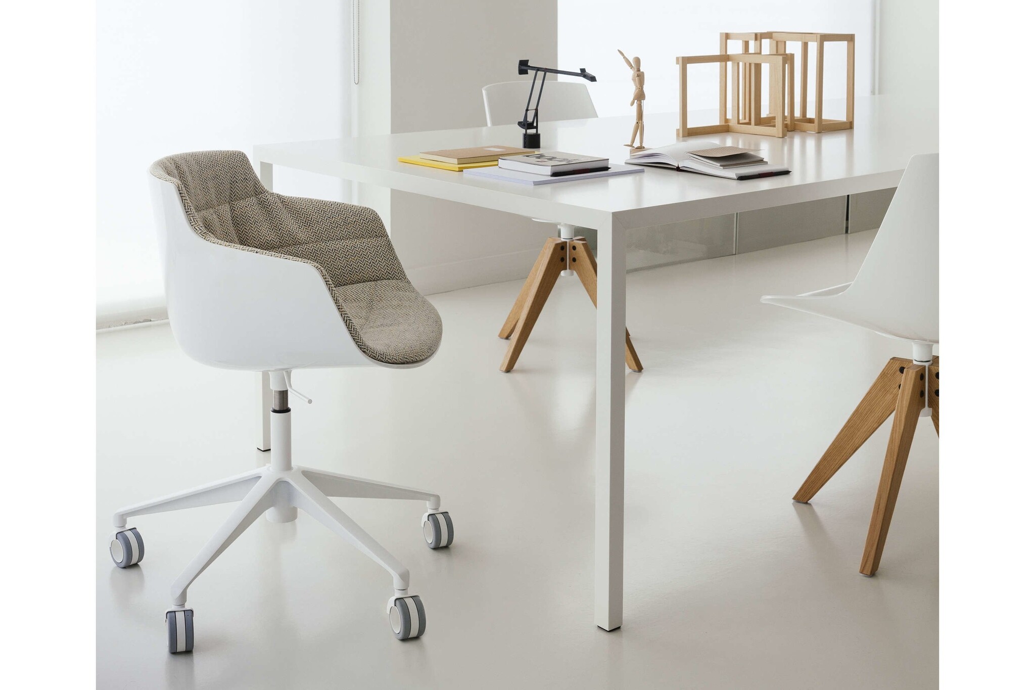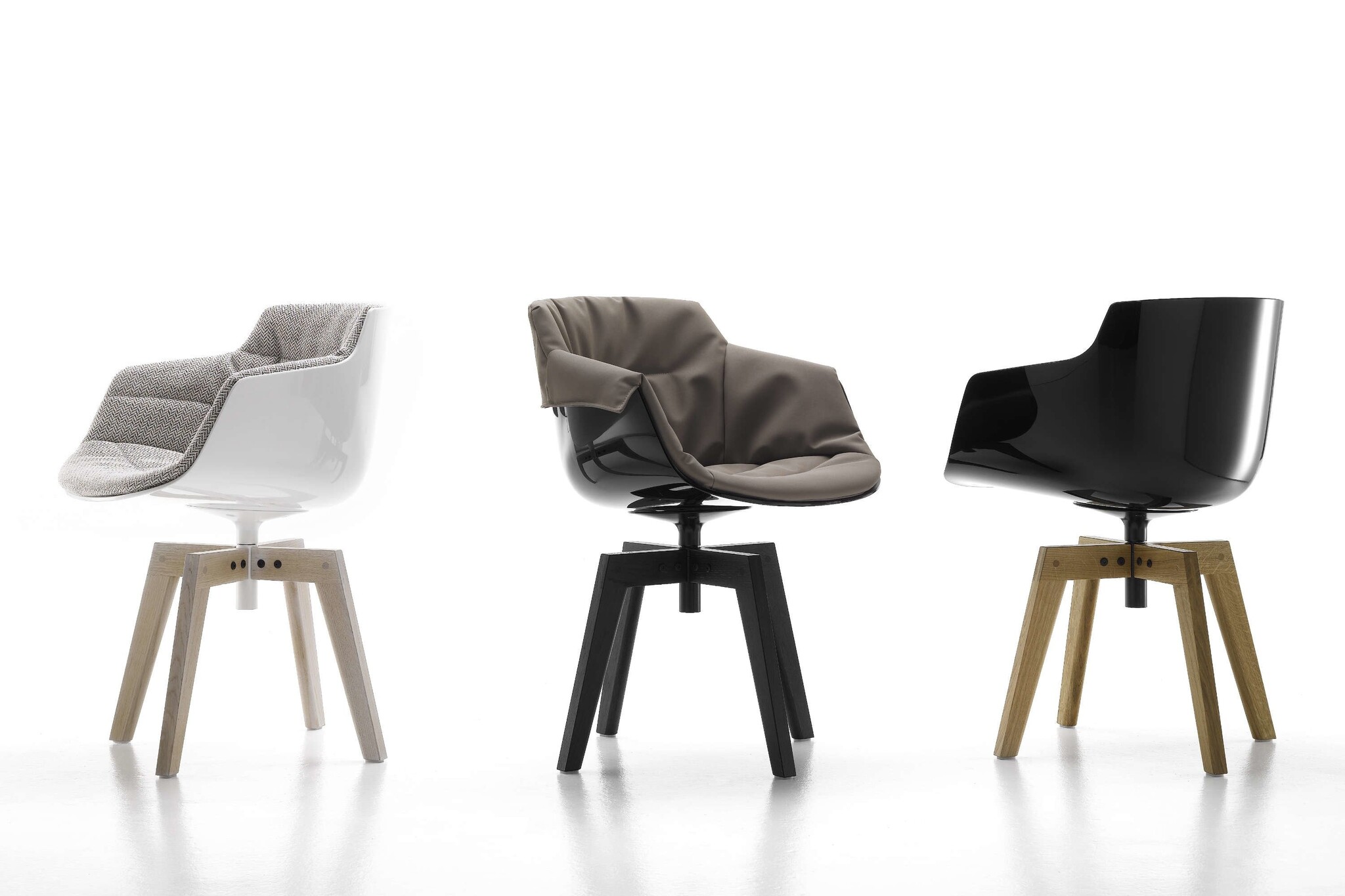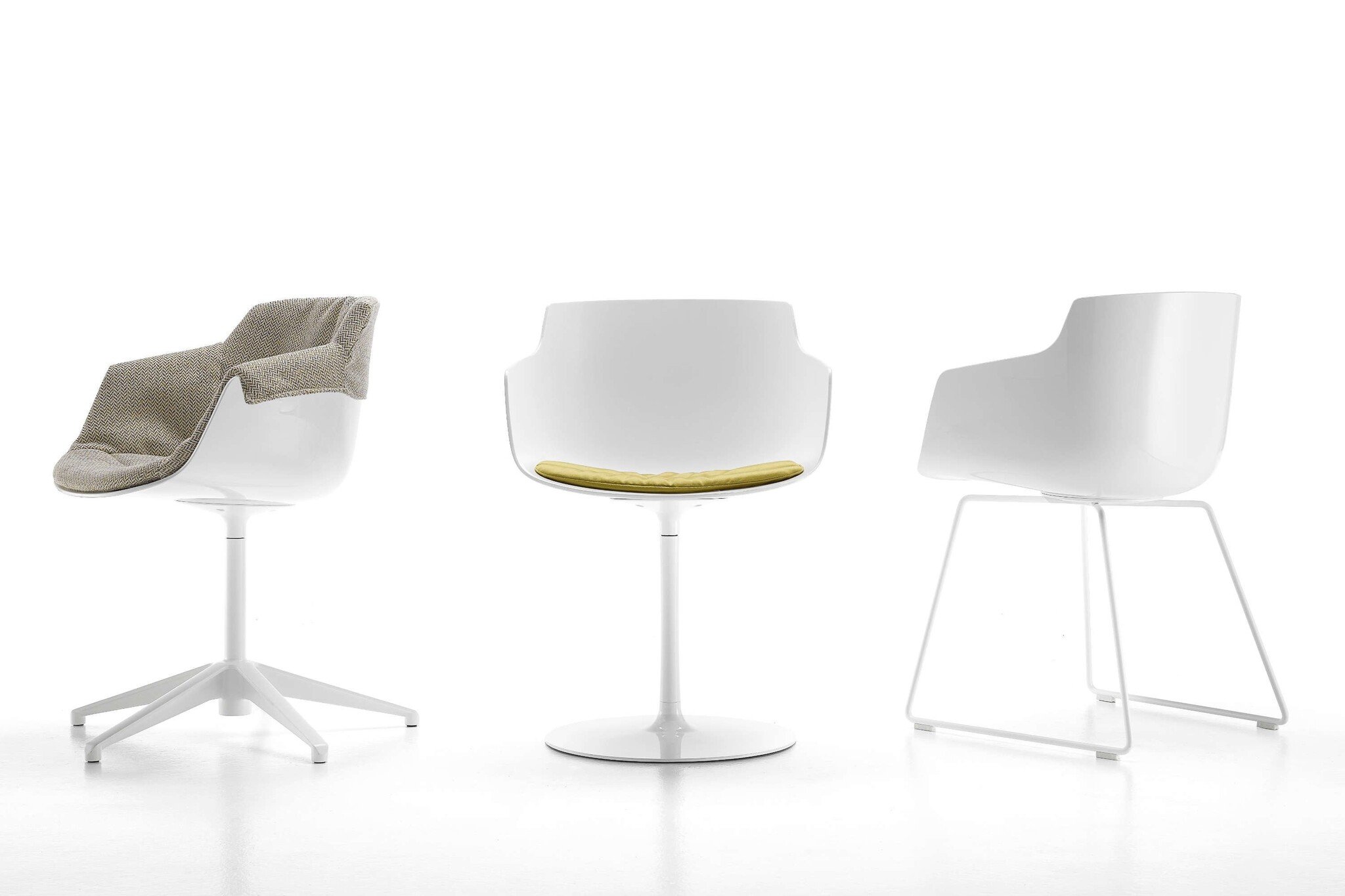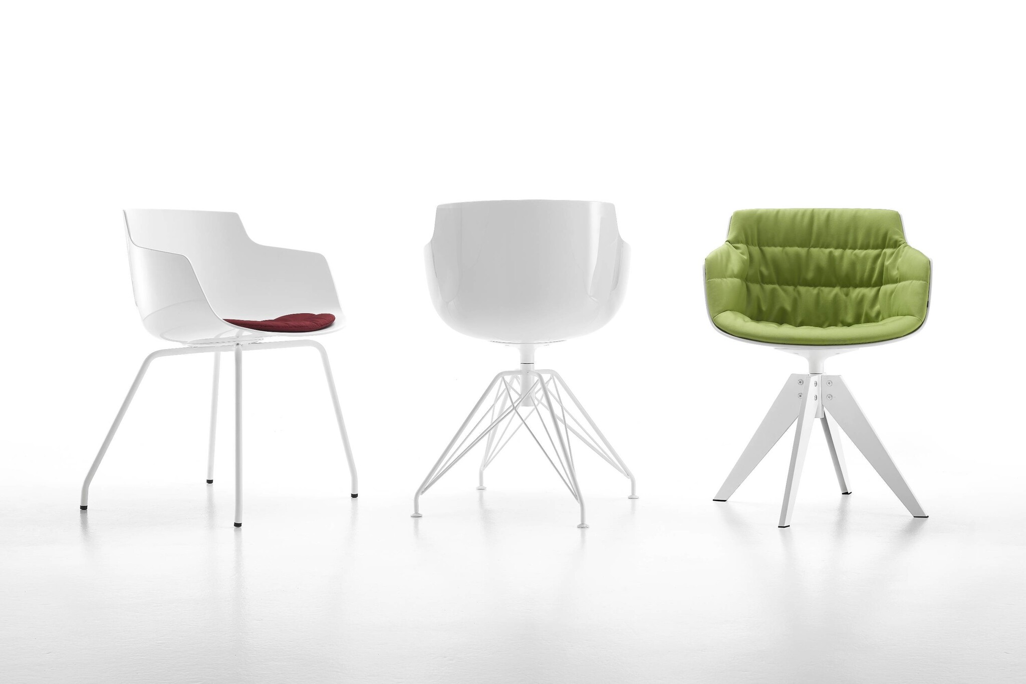 Mdf Italia Flow Slim Armchair, een nieuwe stoel voor de Flow collectie. De zitkuip kan in het wit, zwart of bekleed worden met een stof uit de MDF stoffencollectie. Daarnaast zijn er die onderstel mogelijkheden; een centrale kolompoot, 4-poots in eikenhout en de nieuwe VN 4-poten ook in het eikenhout.