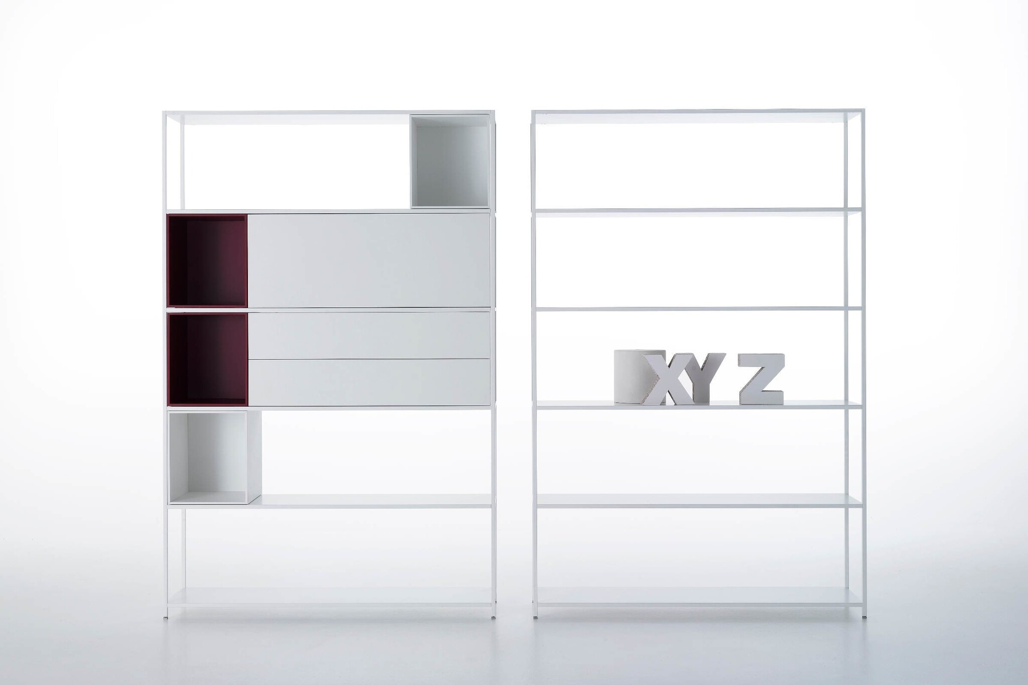 De Mdf Italia Minima 3.0 kasten bestaat uit drie elementen die een kantoorkast samenstelt: een plank, het frame, en een kastdeur. De keuze is aan u om hier een lage kast, hoge kast, staande kast, hangende kast, open kast of kast met deurtjes van te maken. Kenmerken Mdf Italia Minima 3.0De kast bestaat uit verschillende standaard elementen, zoals open kastjes, ladekasten, boekenkasten in verschillende breedtes en hoogtes die vrijstaand zijn of aan de muur opgehangen kunnen worden.