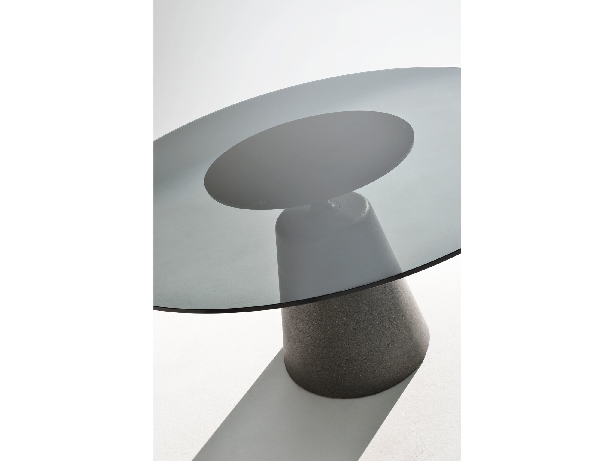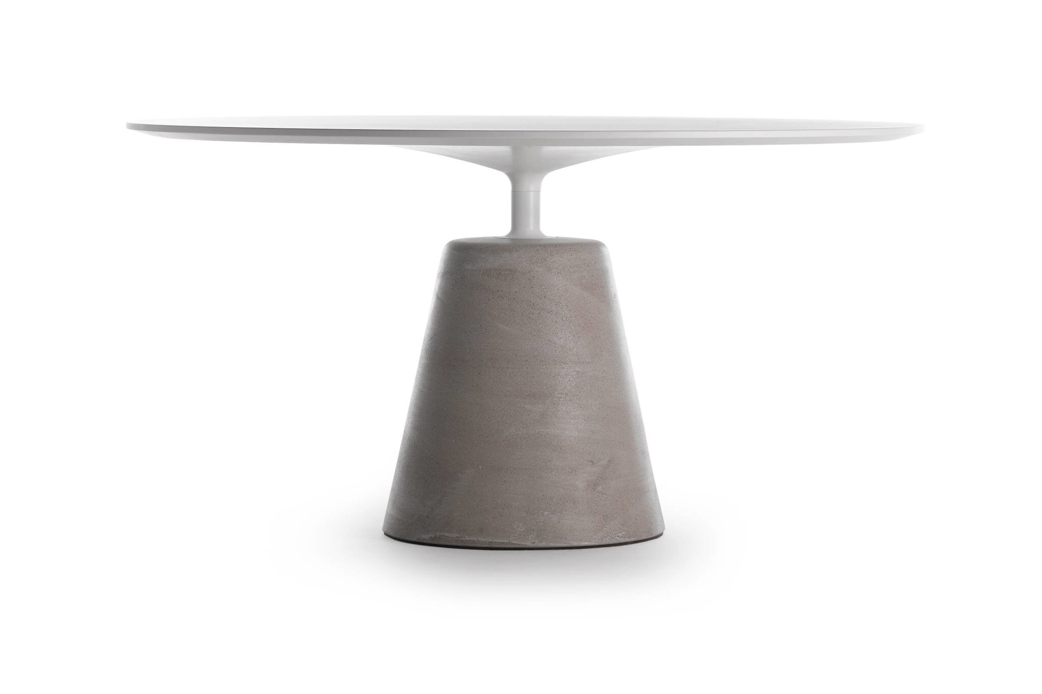 De componenten die de basis met het tafelblad verbinden zijn gemaakt van aluminium en zijn poedercoating met mat wit of antraciet gelakt. De basis die in natuurlijke cement leverbaar is, wordt geleverd met hulpstukken in mat wit. De basis die in antraciet cement leverbaar is, wordt geleverd met hulpstukken in mat antraciet.