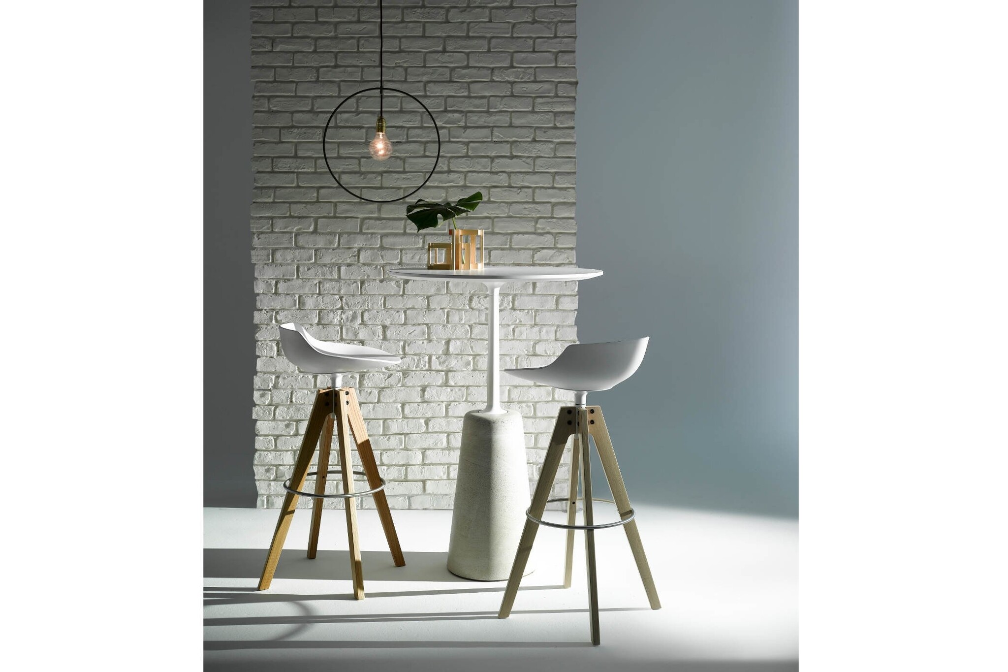 • smal onderstel (met een buitendiameter van 34 cm op vloerniveau) en leverbaar met tafelbladen van 80 en 100 cm groot in diameter