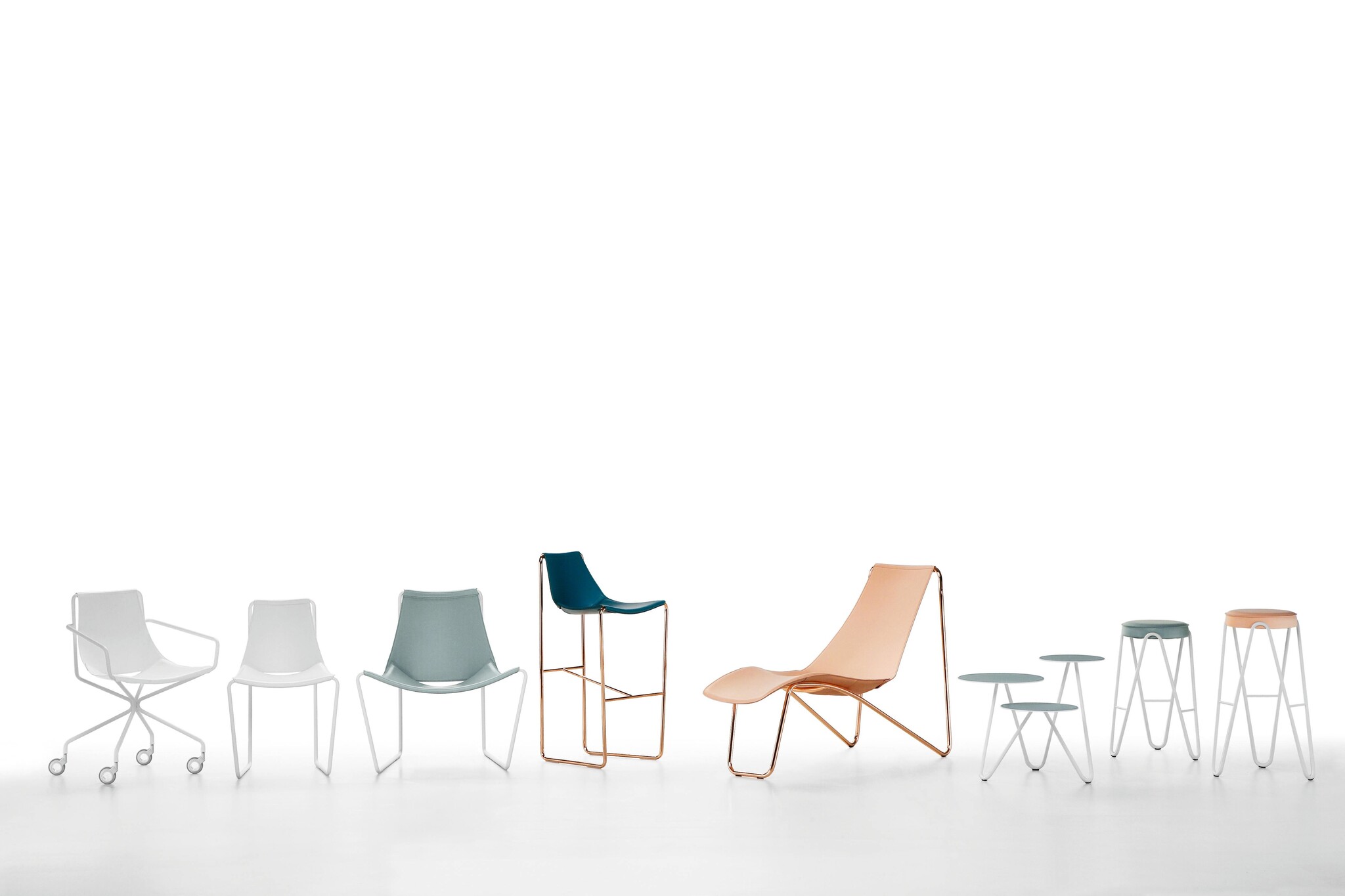 De zitting en rugleuning van de stoelen zijn vervaardigd van leer, leverbaar in 20 verschillende kleuren, van moderne pasteltinten tot tijdloze kleuren als zwart, wit en naturel.