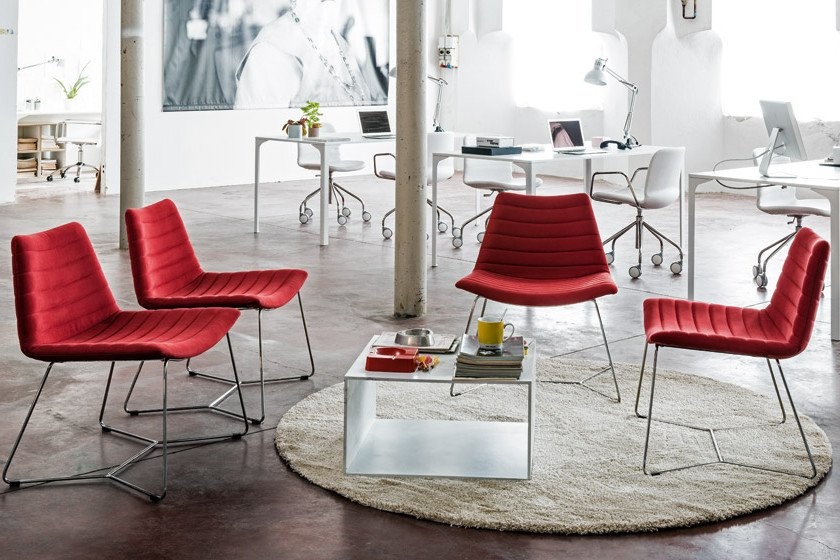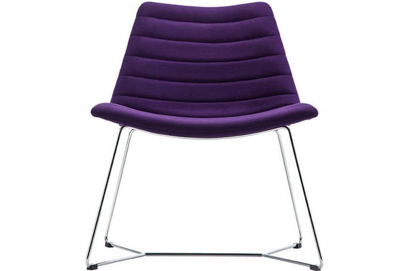 Cover ATT T: lounge fauteuil met sledebasis verkrijgbaar in chroom of gelakt staal. Gestoffeerde schaal in leer, ecoleer, stof of op maat gemaakte stof.