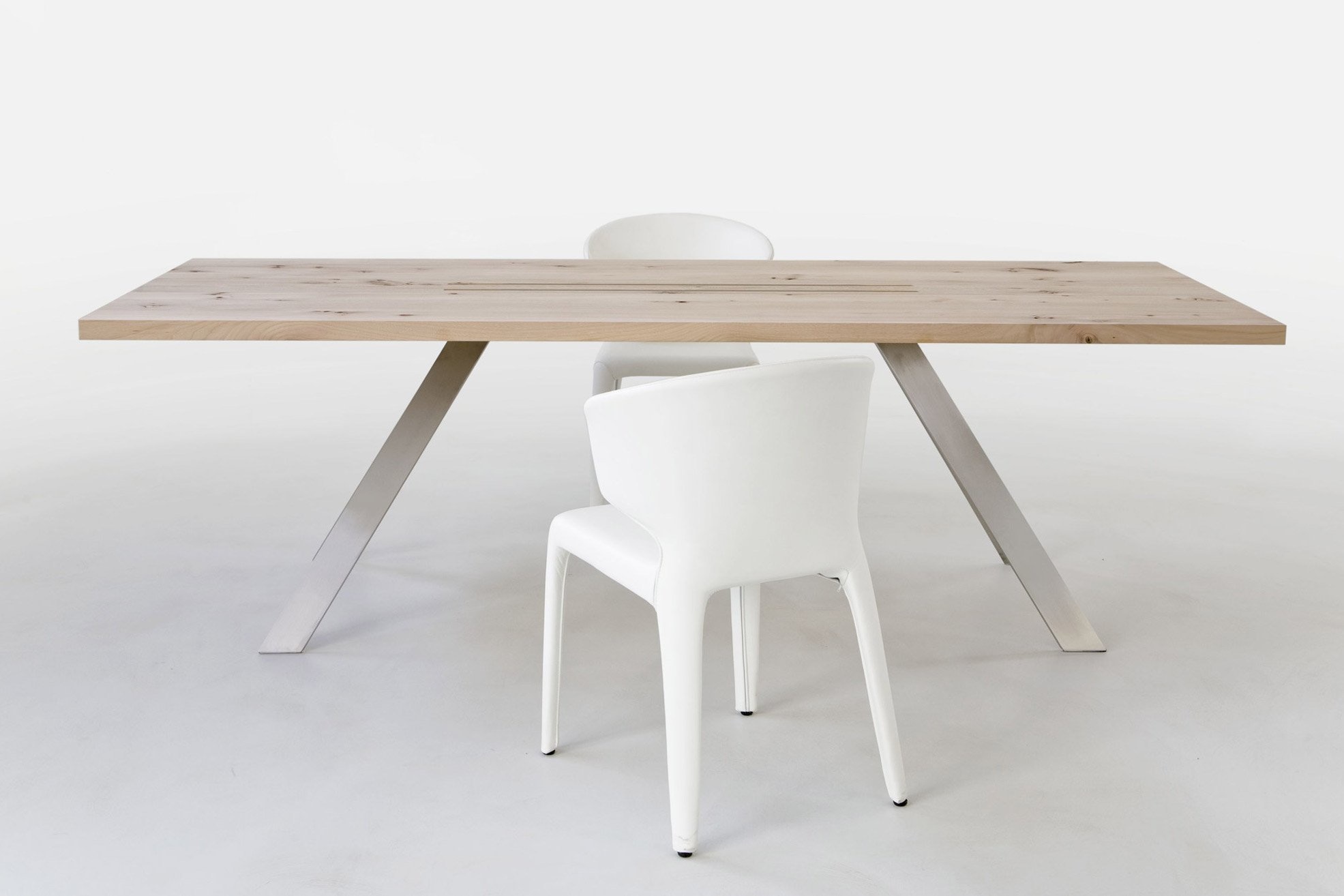 Het stoere tafelblad van Mobimex L'Arc wordt gedragen door 2 metalen bogen die als het ware versmelten met het massief houten blad. Dante Bonucelli heeft aan de vraag van Mobimex, naar een nieuw product L'Arc waar een natuurlook blad bij hoort, meer dan voldaan. Naast de 'naturart' versie met de prachtige noesten en scheuren die haar natuurlijke uitstraling behouden, wordt de tafel ook geleverd in een houtkwaliteit zonder de grovere noesten. Het onderstel van Mobimex L'Arc wordt gemaakt in mat en glanzend geborsteld chroom en gebruineerd (zwart) en geborsteld staal.