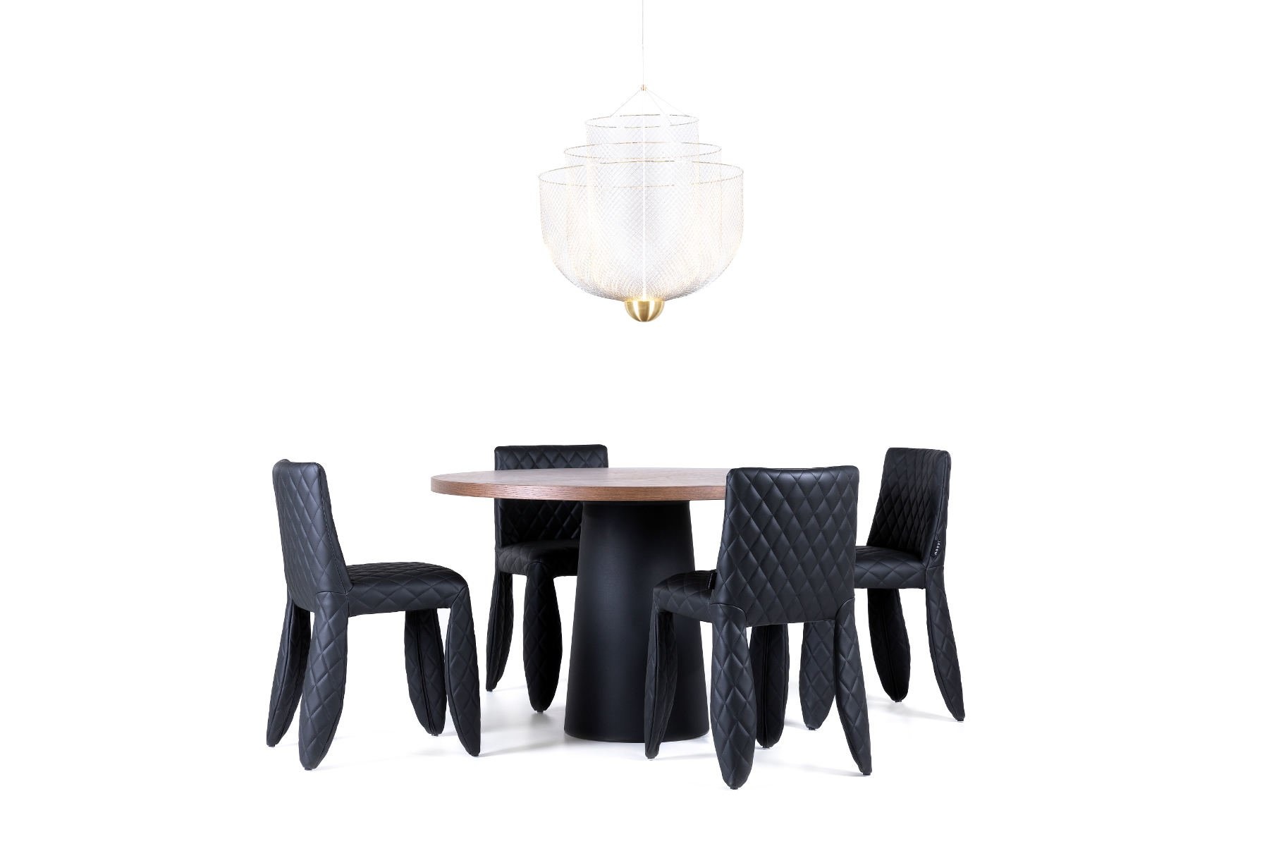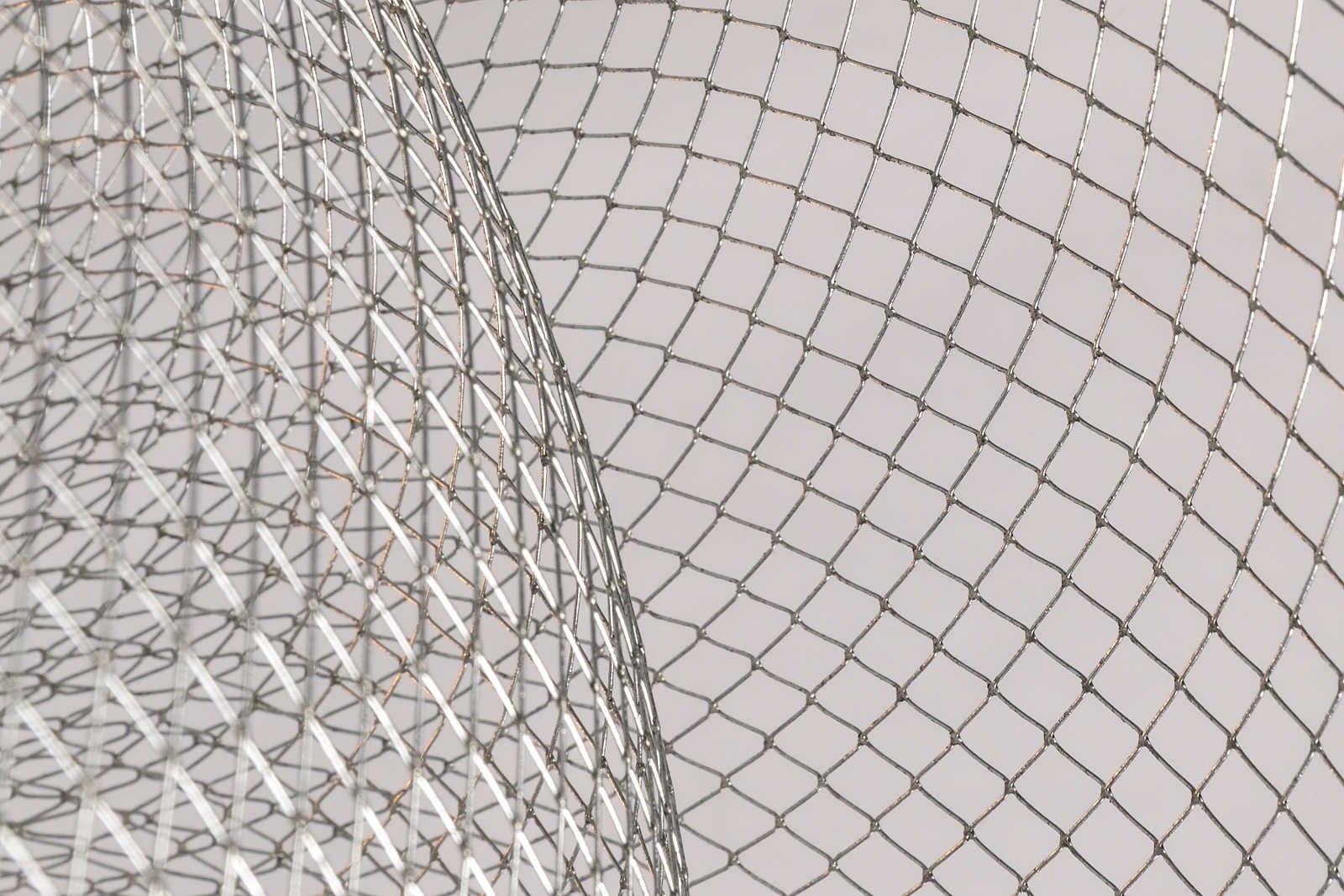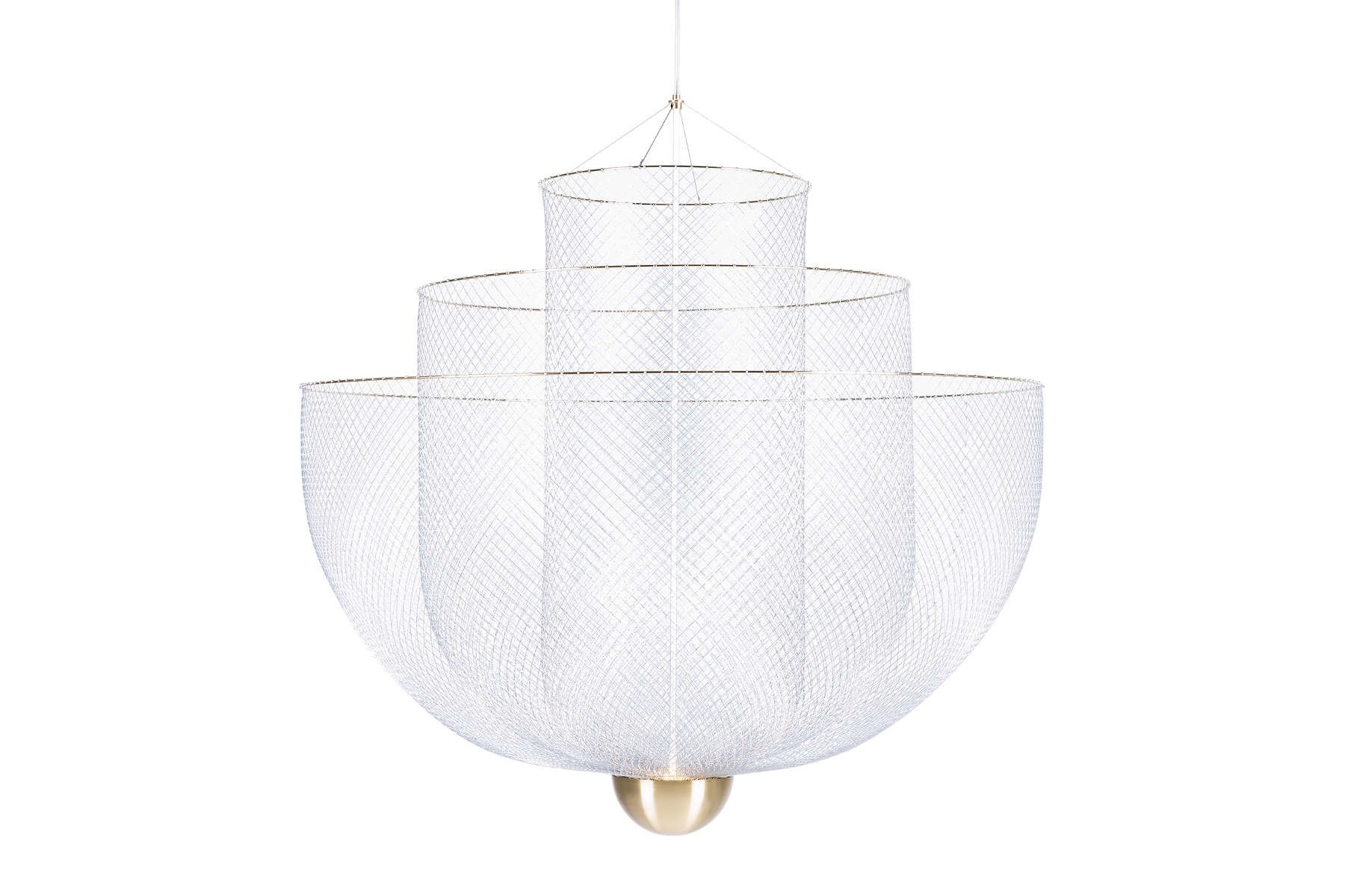De Moooi Meshmatics hanglamp is een prachtige aanvulling op uw ruimte. Deze lamp doet haar naam danken aan de Mesh structuur die bij de lampenkap te zien is. Dit ziet er indrukwekkend uit doordat het eigenlijk als het ware drie kappen zijn: één brede kap aan de buitenzijde, daarbinnen een wat smallere, lange kap en daarbinnen nog één smalle, wat hogere kap. Aan deze laatste zijn draden gekoppeld waarmee de lamp kan worden opgehangen. Een mooi product voor in een lounge, lobby of hal. Eigenschappen van de Moooi Meshmatics hanglamp