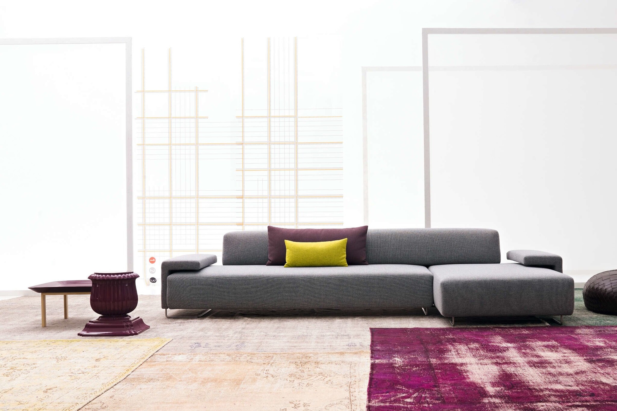 Moroso Lowland een elegante bank die bestaat uit een breed palet aan basiselementen. De elementen kunnen elke denkbare bank vormen. De bank heeft een structuur van foam en staat op roestvrij stalen poten, met stoffen bekleding. De Lowland is door Patricia Urquiola ontworpen voor Moroso.