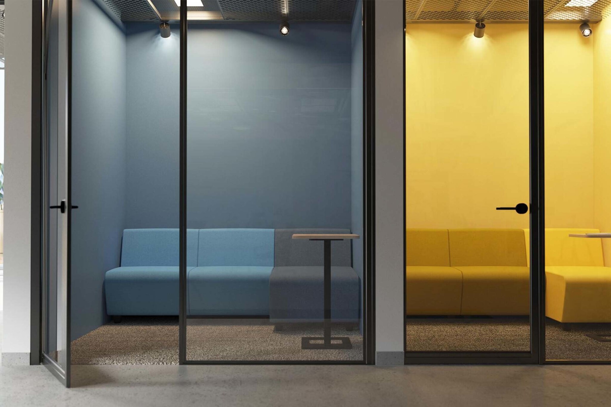 Lage of hoge akoestische schermen (klasse C) eventueel voorzien met een tafeltje