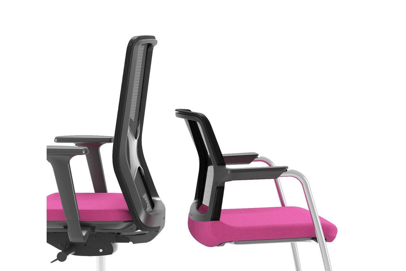 De rugleuning van de stoel volgt dezelfde lijnen en ontwerpprincipes van de bureaustoel en bezit tegelijkertijd enkele unieke kenmerken.