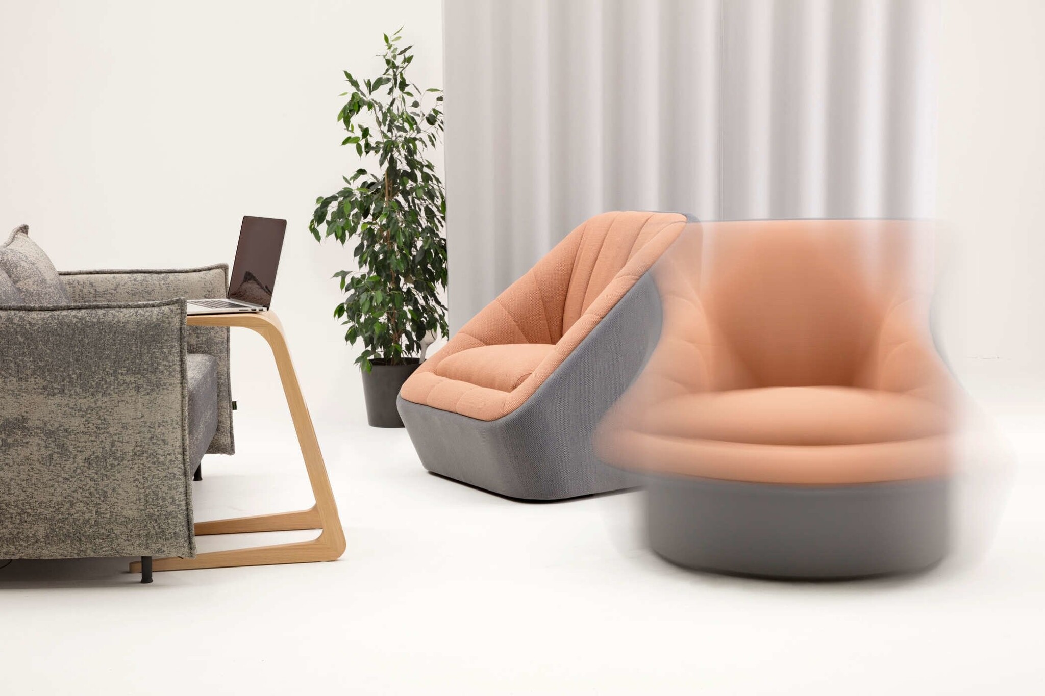 Twee varianten leverbaar: de fauteuil met of zonder draaimogelijkheden. Deze is verborgen in het onderstel.