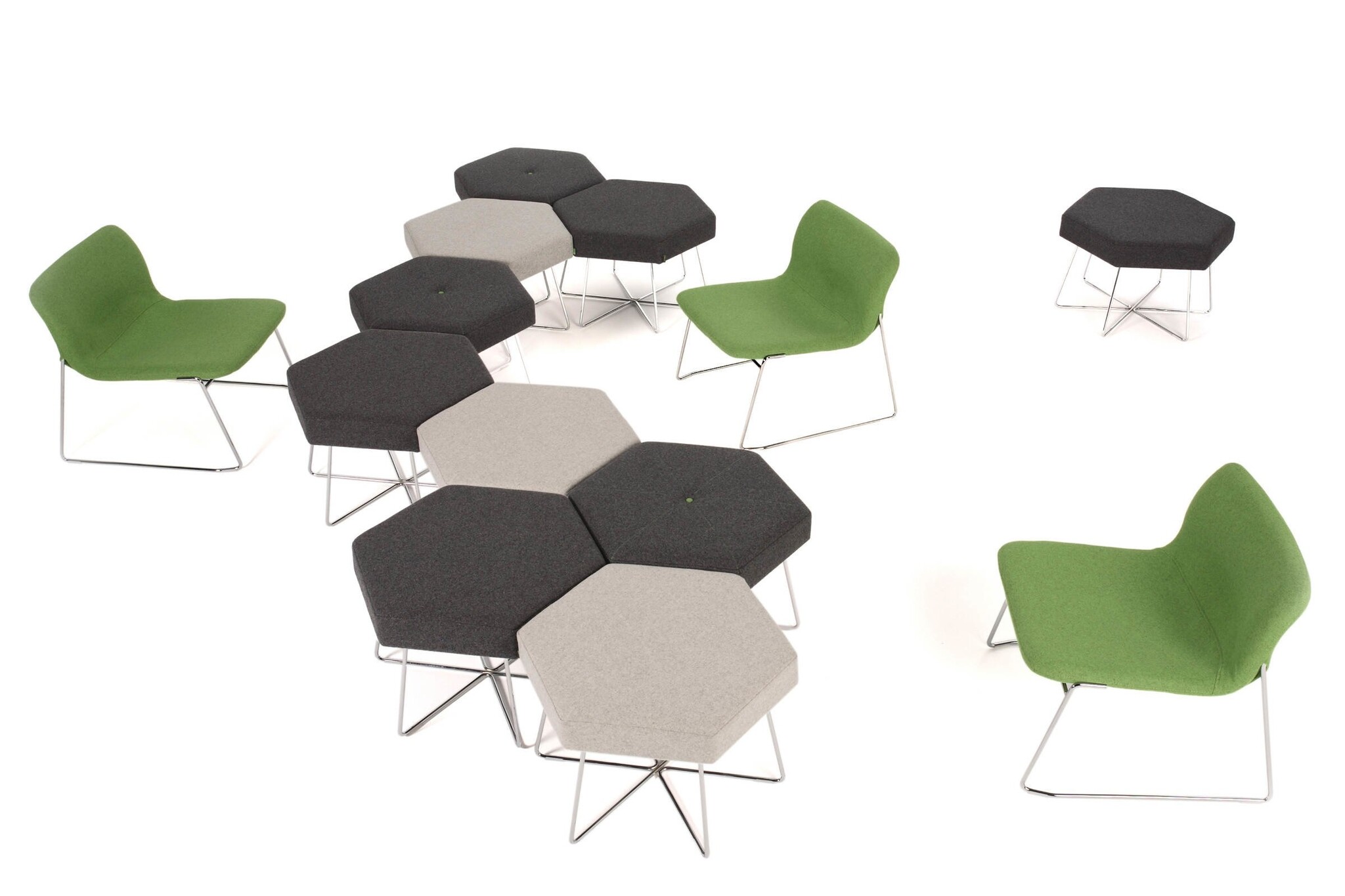 De Naughtone Pollen is een tafel of poef gemaakt in de vorm van een hexagon. Deze kan in herhalende vorm worden gebruikt in zowel kleine groepen, rechte lijnen, bochten of verscholen in hoeken. Dit maakt Pollen een echt dynamische poef en tafel voor elke zakelijke, publieke of educatieve ruimte. De tafels en stoelen gebruiken dezelfde basis, zodat ze mooi bij elkaar passen. Gebruikte materialen Nauhtone Pollen