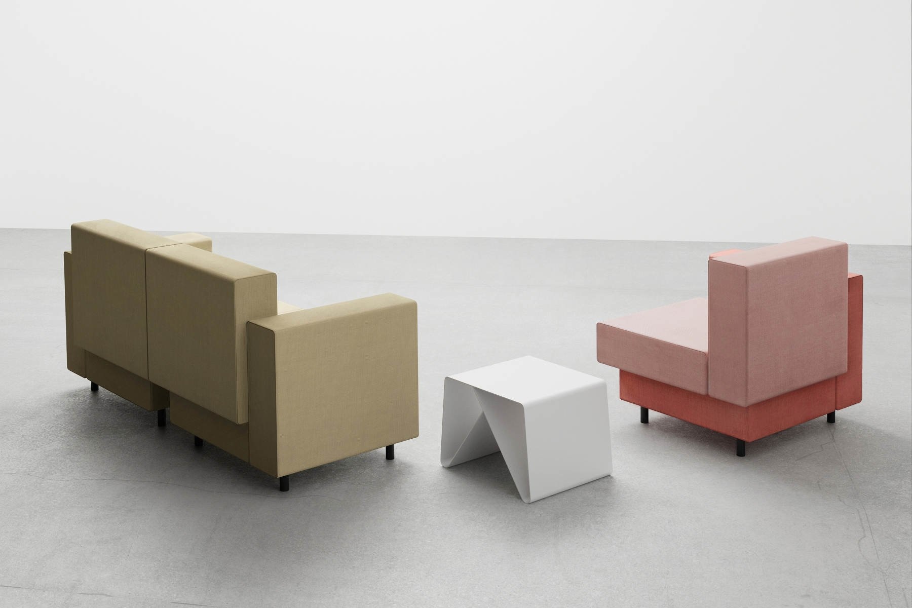 Deze fauteuil bevat 2 elementen die in de vorm van een L zijn gemaakt. Deze twee L-vormen zijn op elkaar gestapeld en vormen zo een geheel.