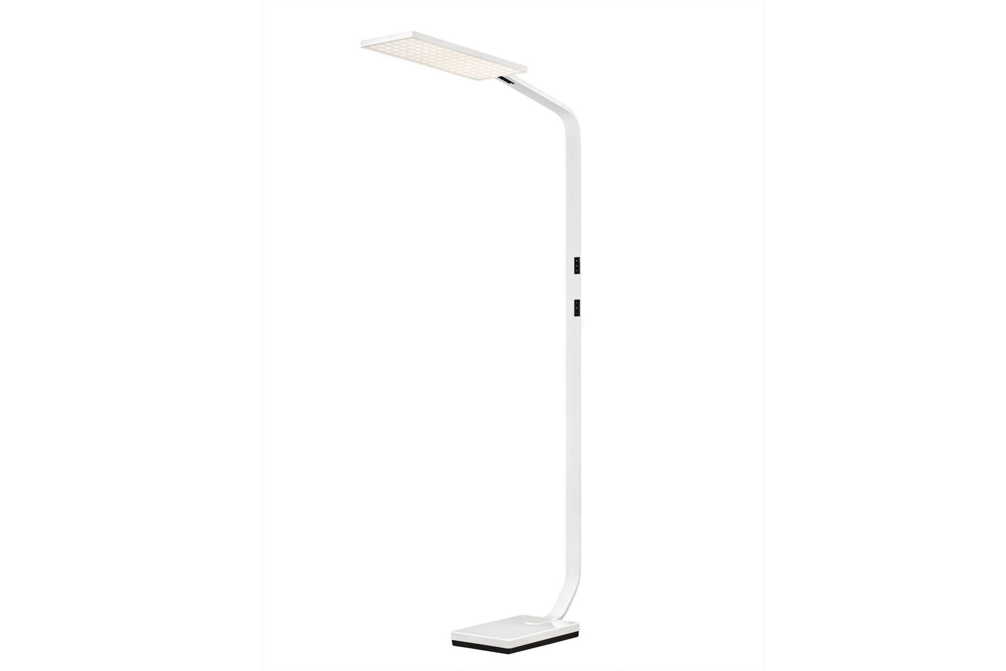 De Nimbus Force One lamp heeft een extreem dunne kop, maar 20 millimeter dik. Het resultaat is een uniform, groot oppervlakverlichting om in te werken. Dankzij de doordachte details en het slanke silhouet heeft de Force One elegantie. De naam is net zo opvallend als zijn vorm: Force One. Als je het voor de eerste keer ziet en gebruikt, ziet alles er zorgvuldig uit. Elk detail heeft zijn eigen logica en zijn elegante en duidelijke contouren genereren een indruk van de algehele samenhang. De cruciale innovaties van de Force One zijn misschien helemaal niet duidelijk op het eerste gezicht, maar worden duidelijk in het dagelijks gebruik. Het hoofd van de lamp steekt ongewoon ver uit over het werkoppervlak en de voet verdwijnt bijna volledig onder het bureau. Om dit te bereiken, heeft de ontwerper Rupert Kopp de technische eenheden in de basis geïntegreerd, hoewel deze zich meestal in de kop van de armaturen bevinden. Dit maakte het mogelijk om een extreem dunne kop van slechts 20 millimeter dik te maken. Het resultaat is een uniforme, grootschalige verlichting van het werkgebied.Kenmerken Nimbus Force One staande lamp