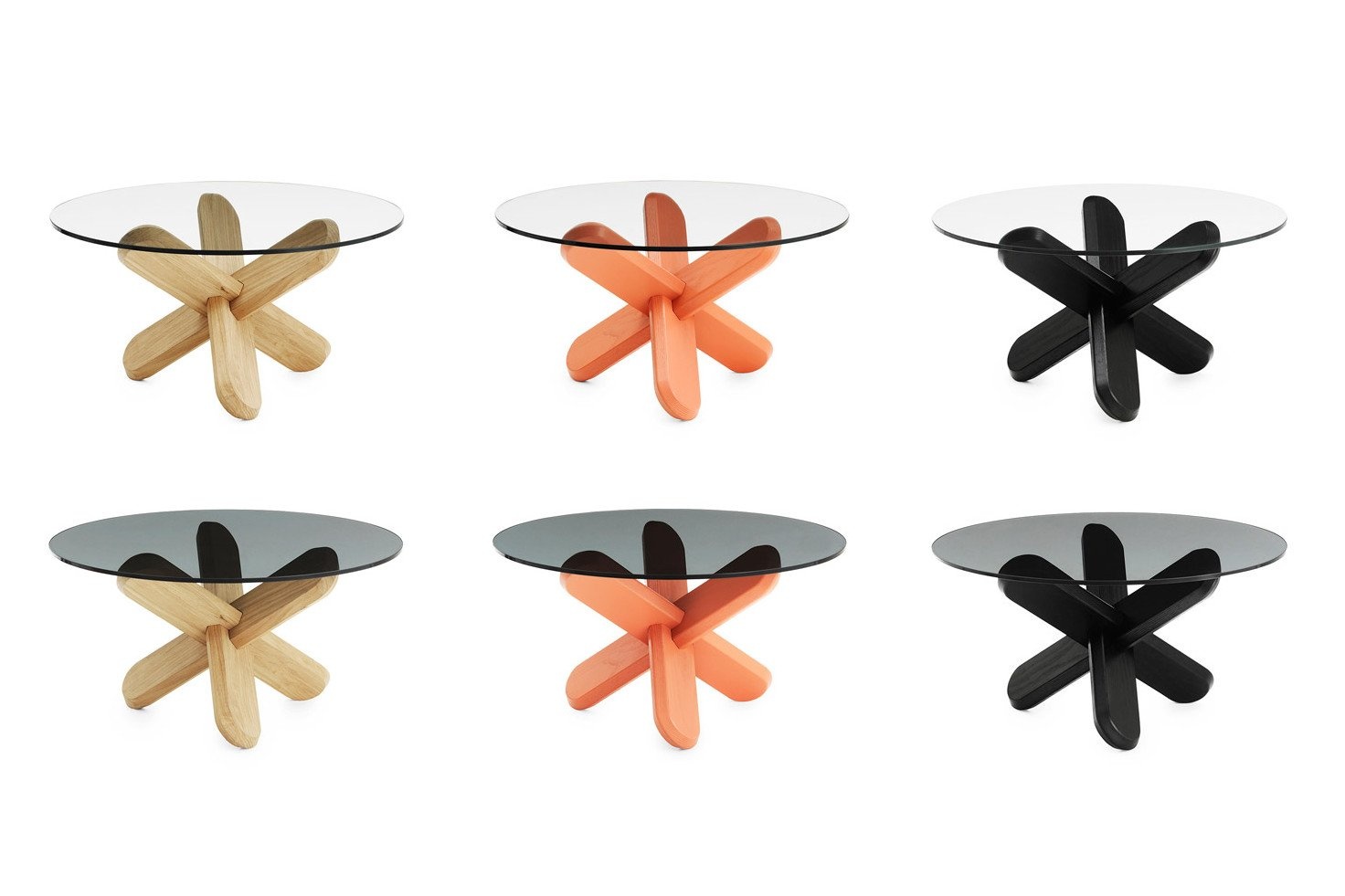 De Ding Table heeft een transparante of donkere glazen tafelblad en een eiken onderstel. De onderstellen zijn beschikbaar in de kleuren: eikenhout, koraal oranje en zwart.