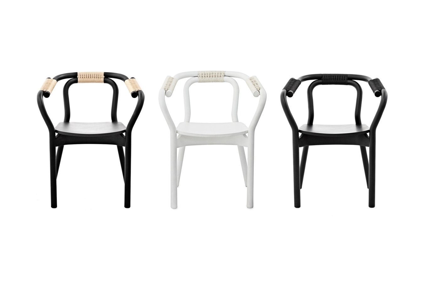 De stoelen zijn gemaakt van essenhout en zijn beschikbaar in de kleuren: wit, zwart, of zwart met een beige afwerking.