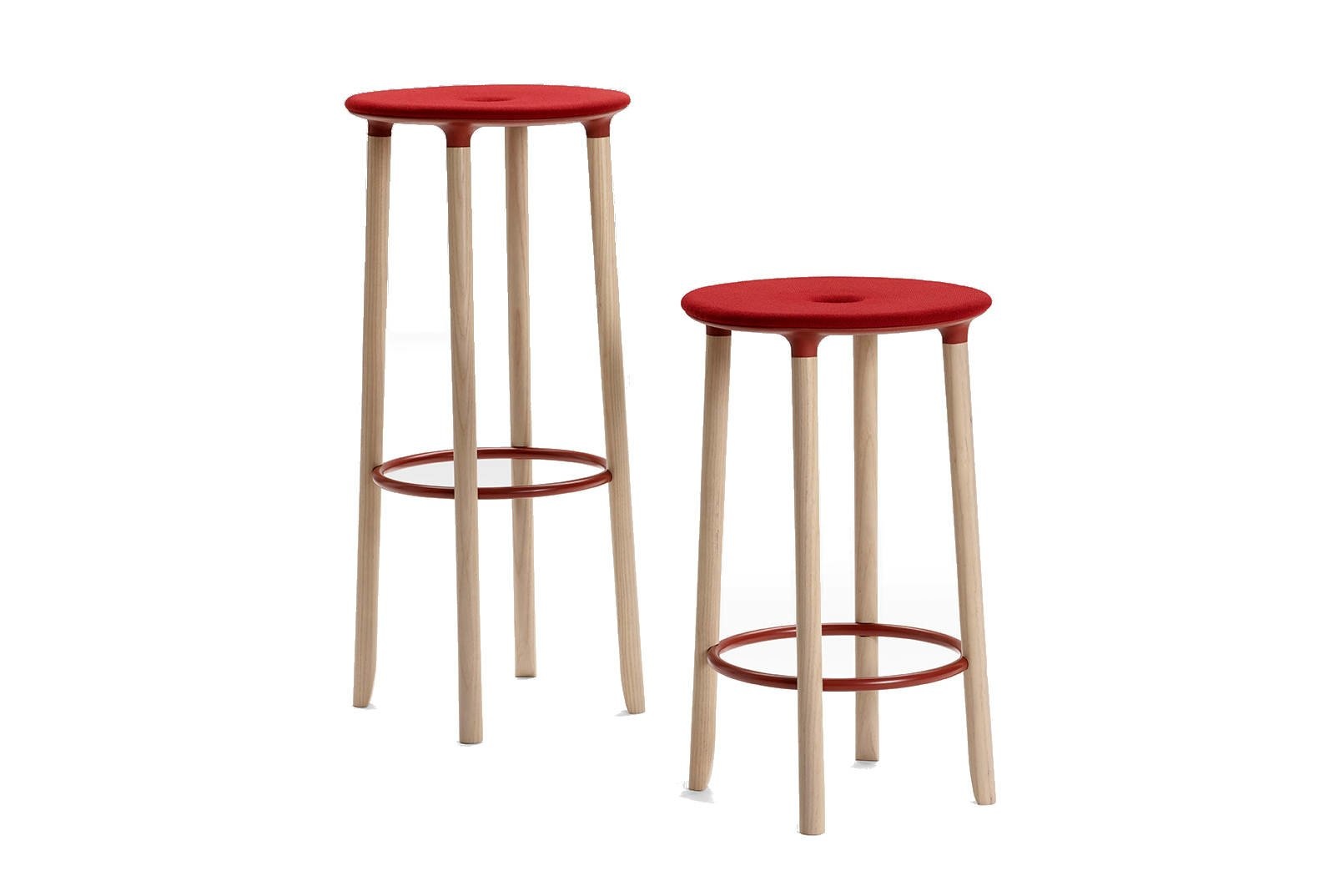 De barkruk is bekleed in stof of leer.