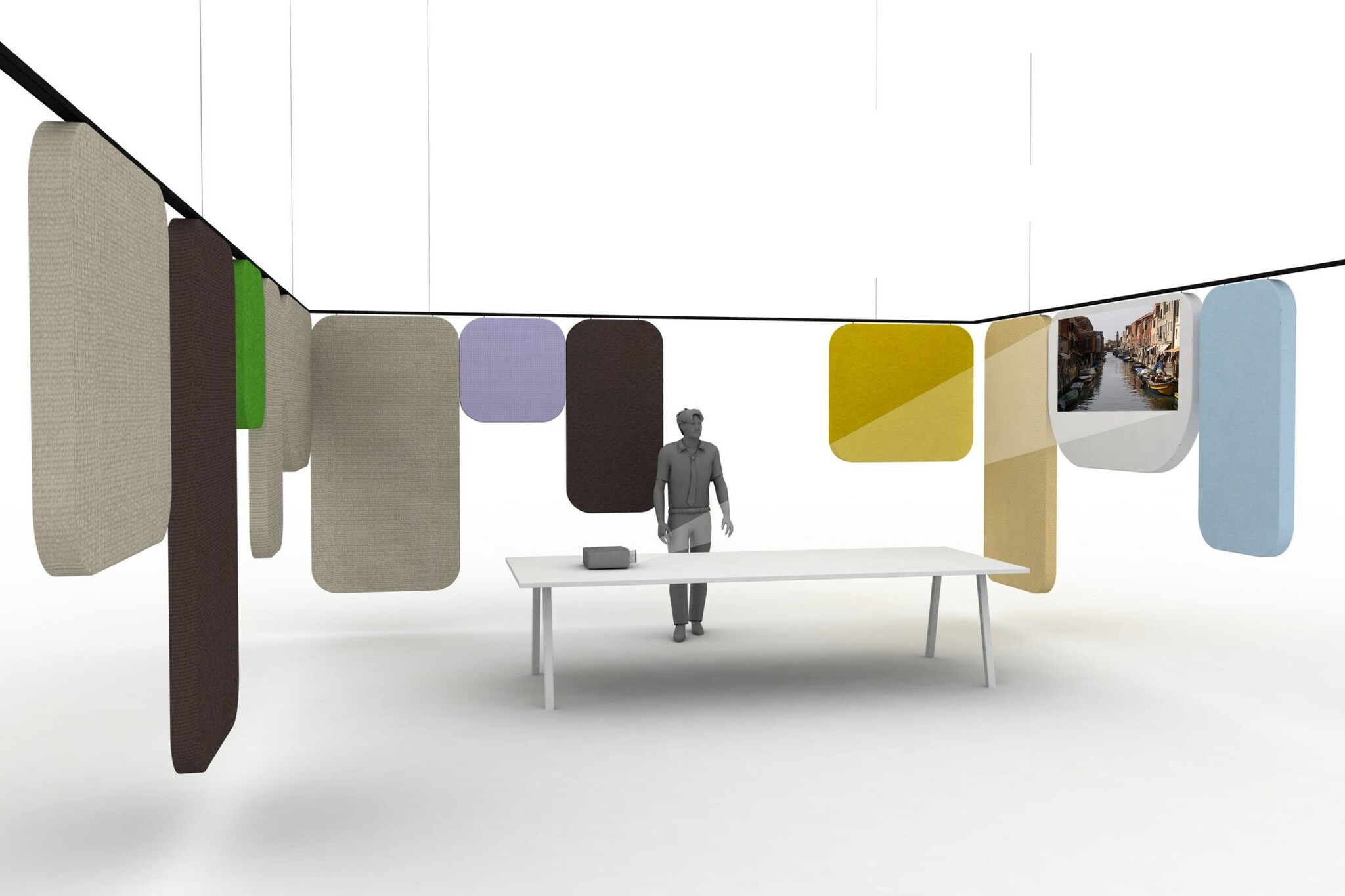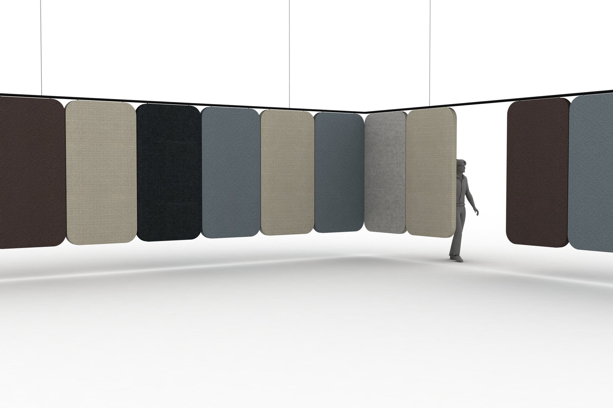 De Offecct Notes akoestische panelen absorberen niet alleen geluid, maar dienen tevens als een fraaie ruimteverdeler. Doordat de panelen aan een railsysteem aan het plafond bevestigd zijn, kan er creatief met de rangschikking omgesprongen worden. In de open ruimtes in kantoren is geluidsoverlast een groot probleem. Met akoestische oplossingen, zoals kasten, banken maar ook akoestische panelen, zoals deze Offecct Notes wordt het geluid gereduceerd, doordat het geluid geabsorbeerd wordt door de panelen. Het voordeel van de Offecct Notes is, is dat ze makkelijk ana het plafond te bevestigen zijn.