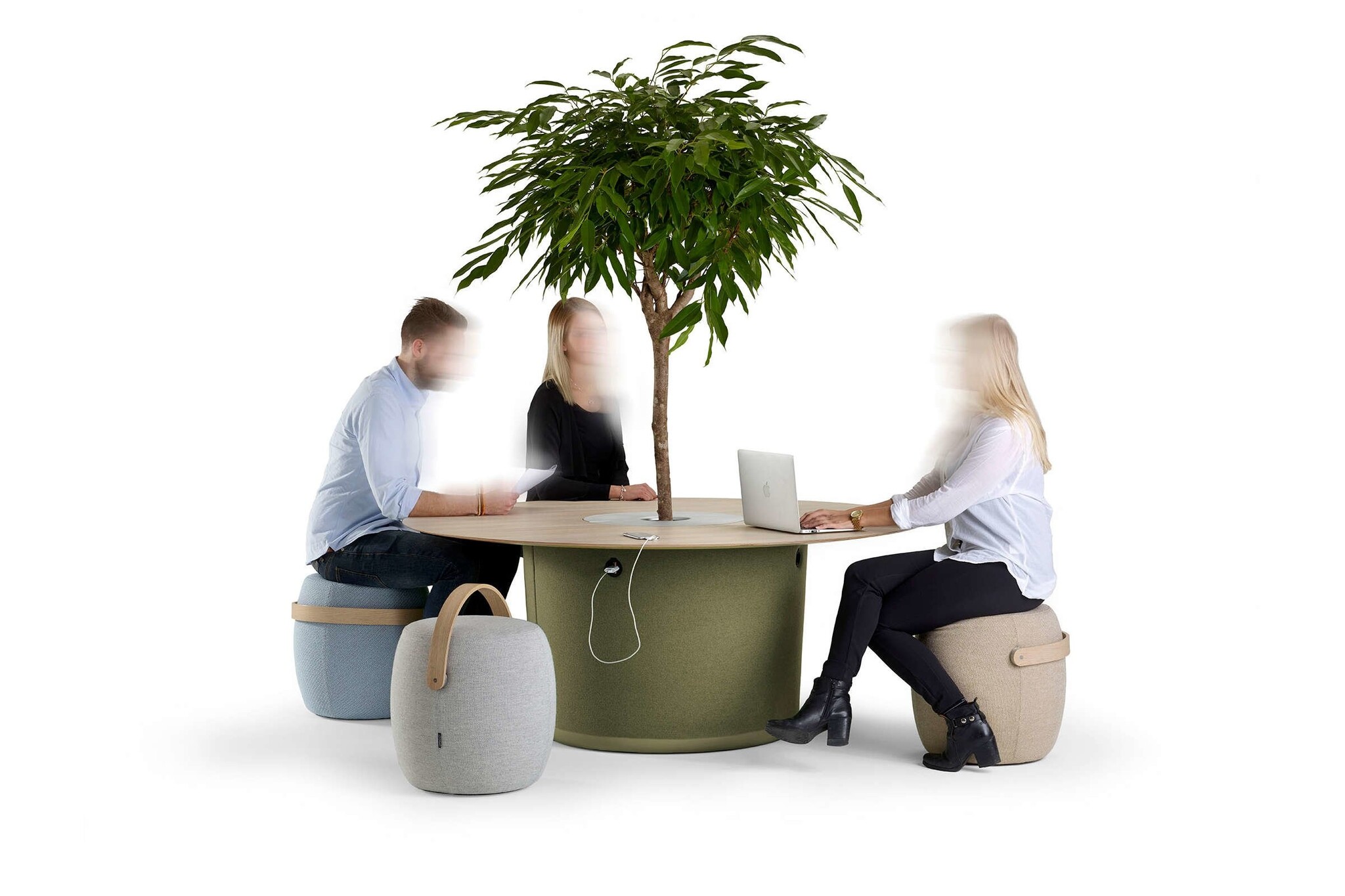 De On Point tafel is ontworpen door Mattias Stenberg, de ontwerper achter de succesvolle kruk Carry On. Deze past dan ook weer goed samen met de On Point tafel. Met zijn zachte en elegante verschijning van de tafel is deze geschikt als een ontmoetingsplek om even bij te praten en kan ook gebruikt worden met planten of andere groenvoorzieningen, om zo een barrière te creëren om wat persoonlijkere gesprekken te voeren. Het tafelblad kan namelijk uitgevoerd worden met een opening waarin een boompje of plant geplaatst kan worden. De tafel is ook verkrijgbaar met een energiebron, zodat het als oplaadpunt in openbare plaatsen, waar elektronische apparaten worden gebruikt, kan fungeren. Deze stopcontacten zitten in de gestoffeerde romp.