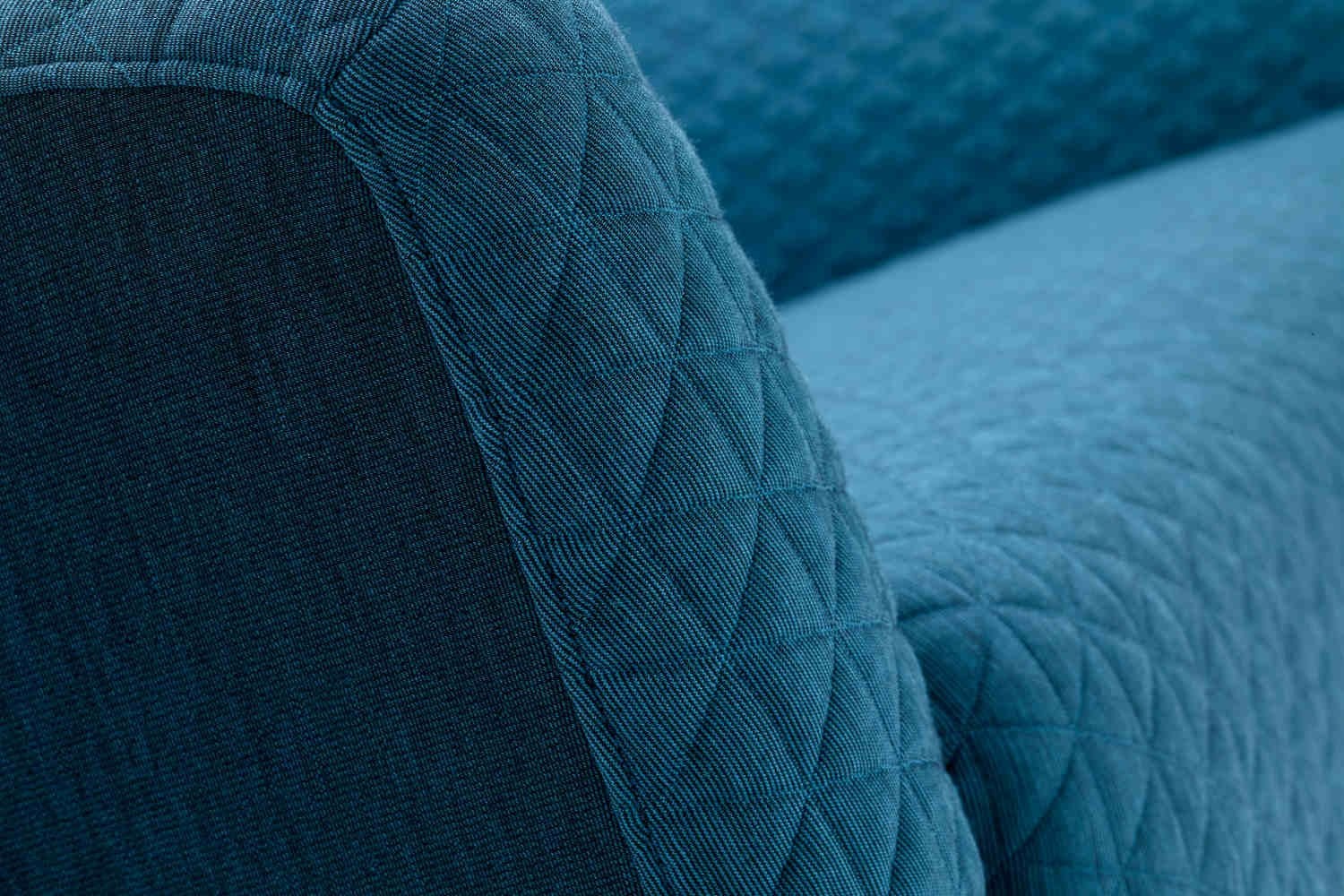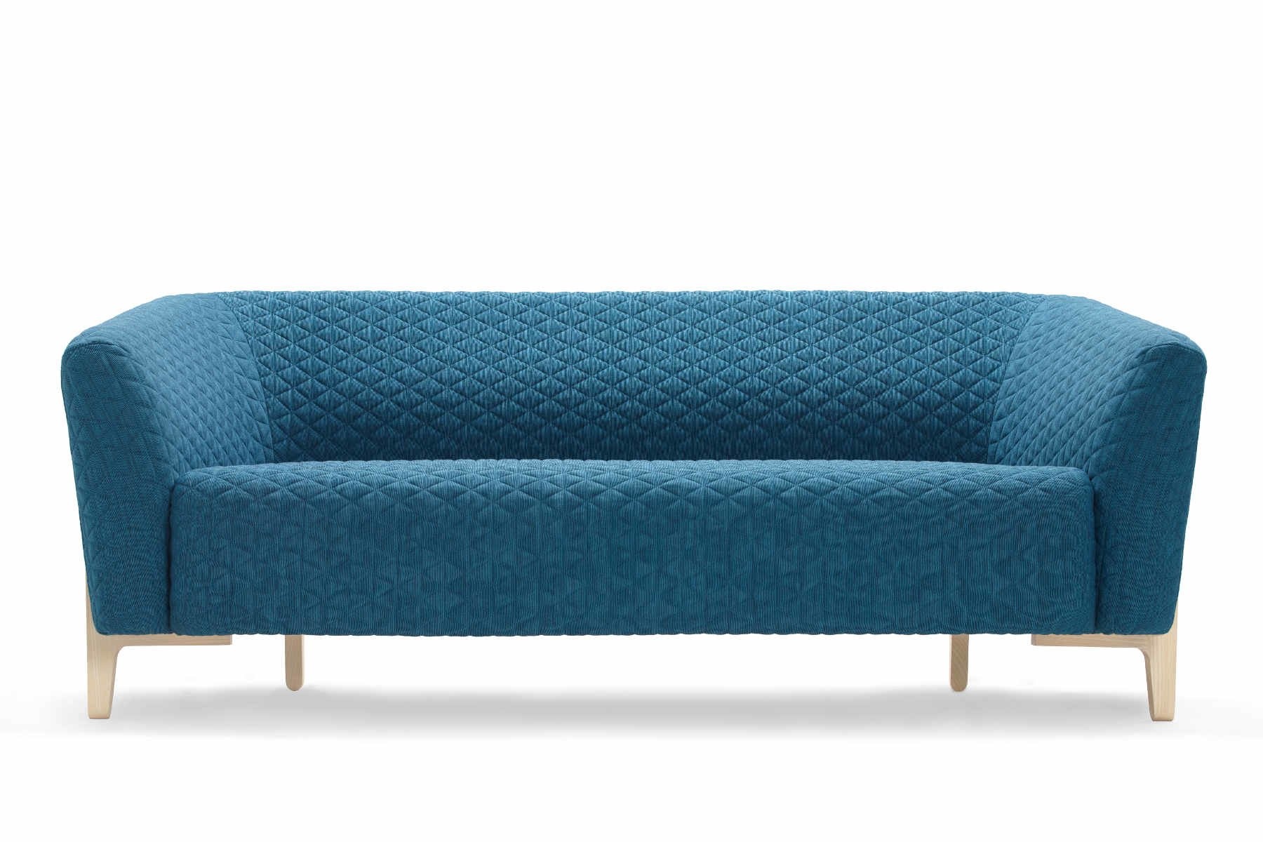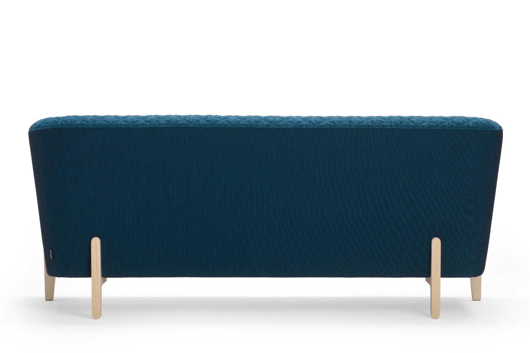 De zitting is gemaakt van gewatteerd textiel, die rust op een subtiel vormgegeven houten frame.