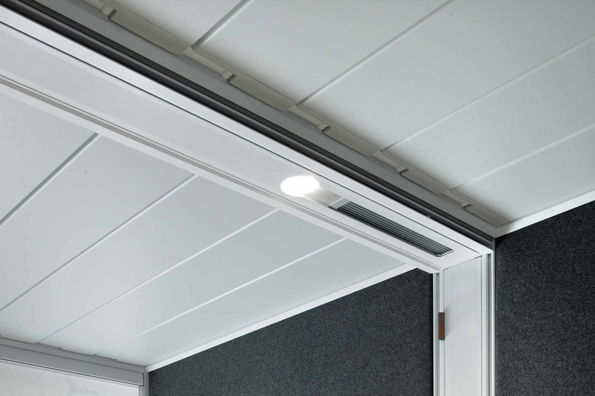 Het internationaal gepatenteerde daksysteem van de Orangebox Air³ beschikt over een geavanceerd brandveiligheidssysteem dat speciaal is ontwikkeld voor kantoren waar sprinklers zijn geplaatst. Zo voorkomt u dat er brand uitbreekt in de akoestische ruimte en kan de sprinklerinstallatie ook de ruimte beregenen.