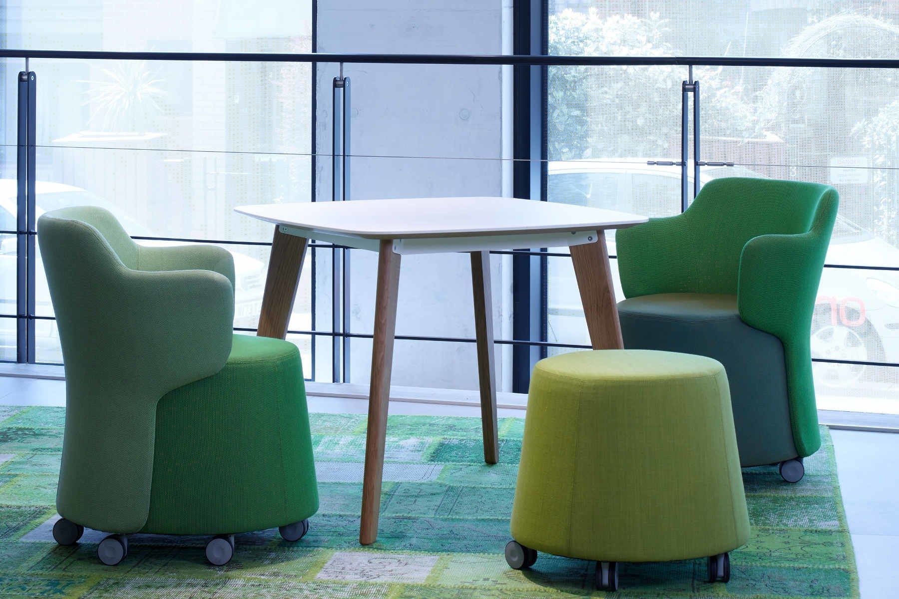 Ook op kantoren is een verrijdbare poef, zoals de Orangebox Sully ideaal. Wanneer deze niet in gebruik is, kunt u ze eenvoudig aan de kant zetten en wilt u even aanschuiven bij een collega, dan pakt u de Sully poef er makkelijk bij. Orangebox staat bekend om oplossingsgericht meubilair dat goed terug te zien is in het ontwerp van deze poef. Voor extra comfort is er ook een poef met rugleuning. Dit is de Skomer.