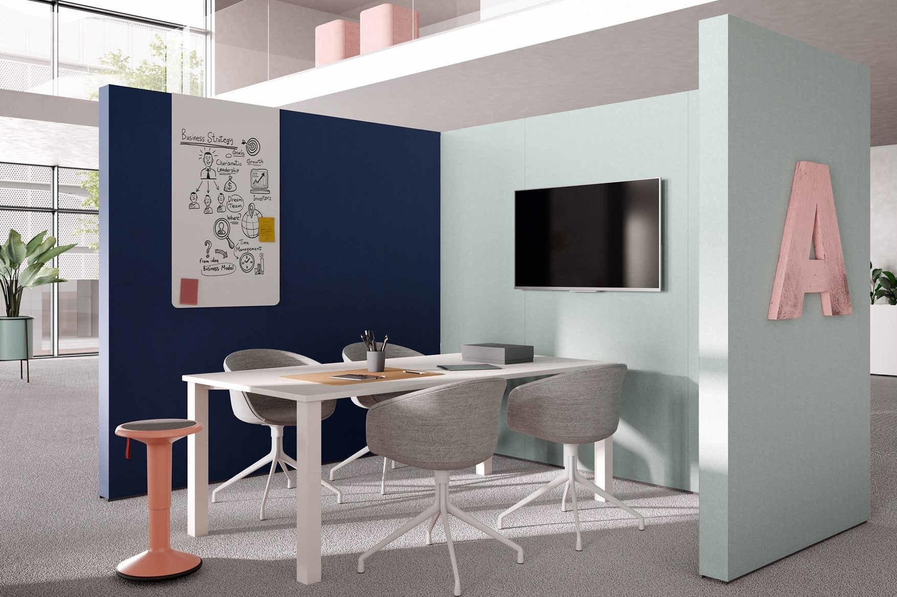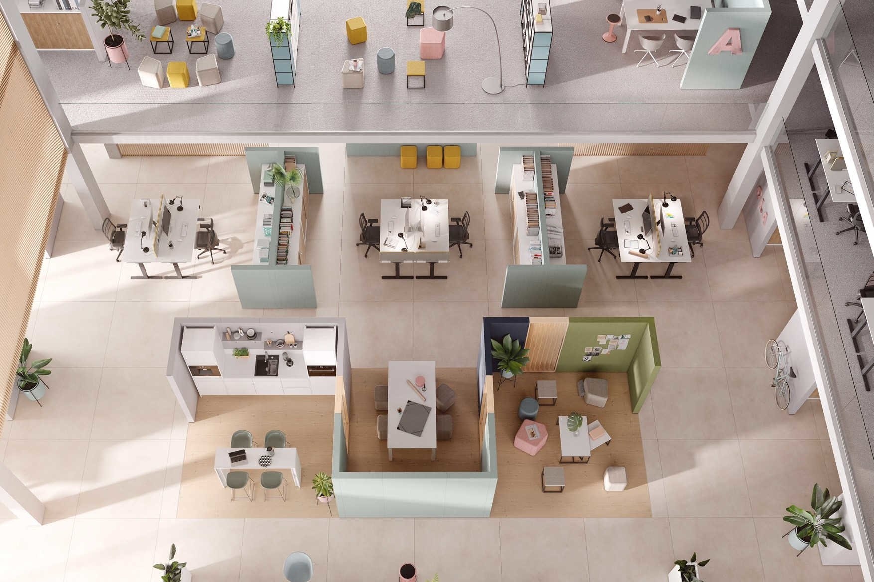 U kunt de Palmberg Clamp wanden als scheidingswand gebruiken om een ruimte te verdelen en zones te maken, maar bijvoorbeeld ook om uw keuken of printer plaatsen, zodat het geluid van het koffieapparaat of printer opgevangen wordt. In open kantoren staat vaak een pantry om bezoekers en medewerkers te voorzien van een drankje.