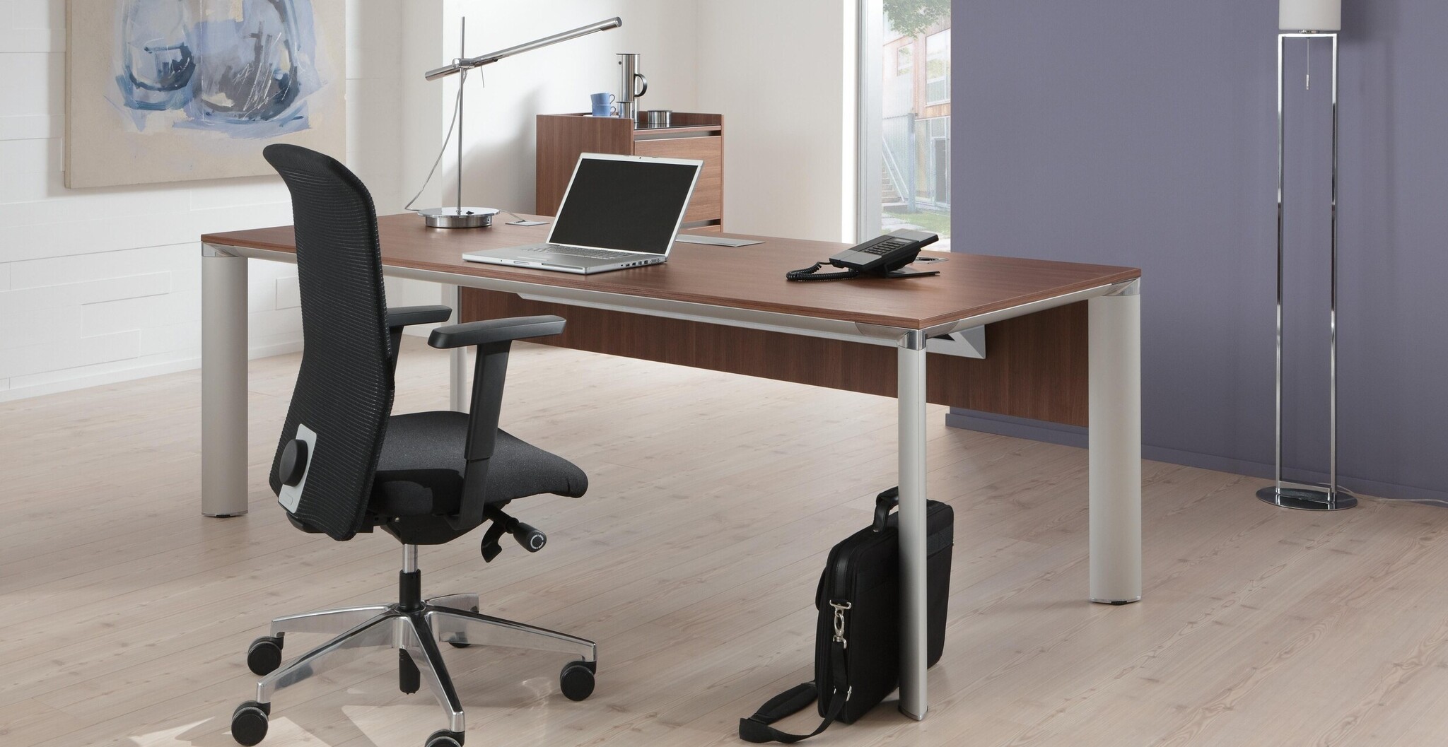 De Palma tafel verbindt een representatieve uitstraling met hoogwaardige materialen en een rijke keuze aan werkbladen. Het tafelsysteem bestaat uit vergadertafels, werkplektafels en directiemeubilair.