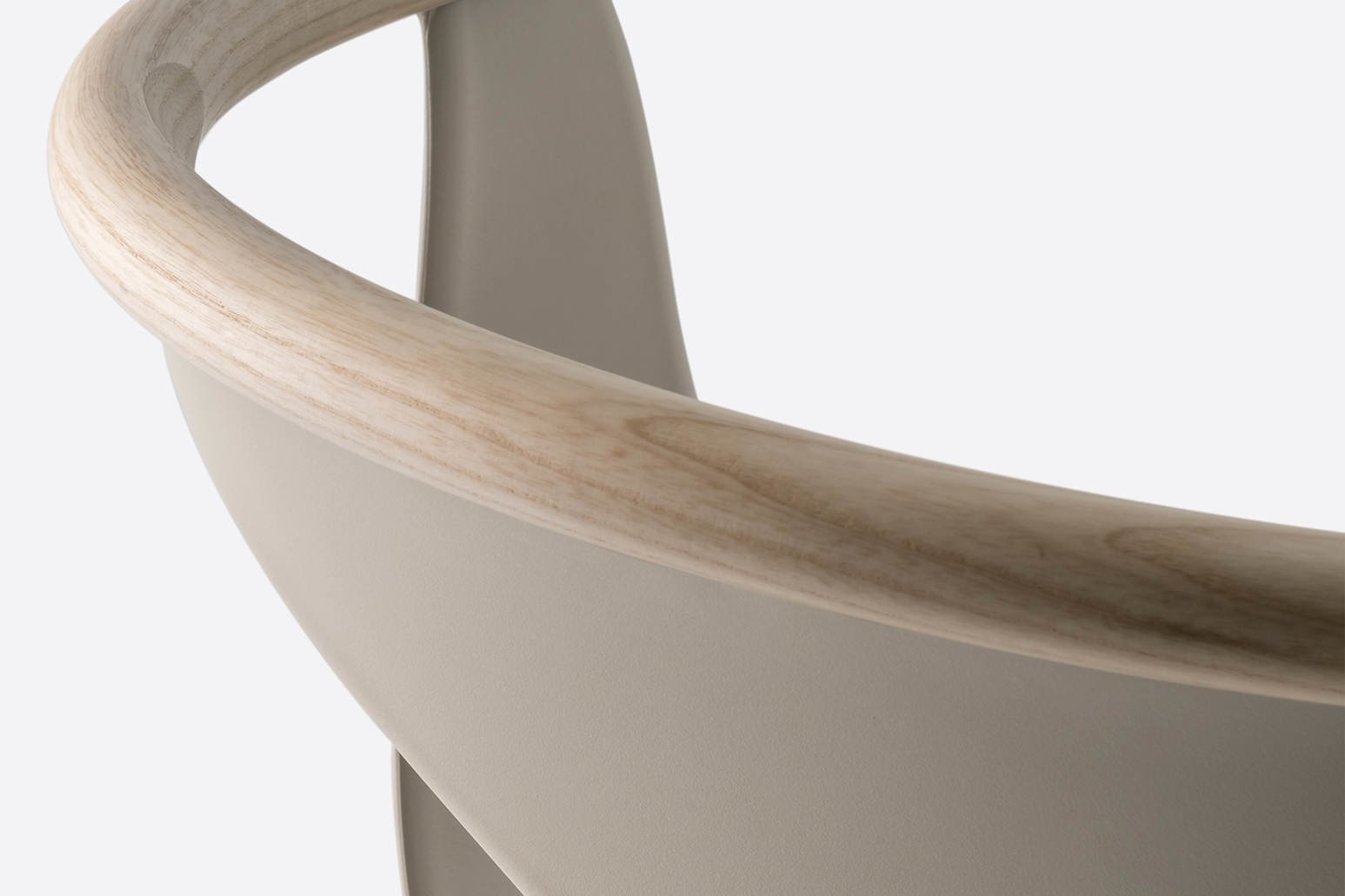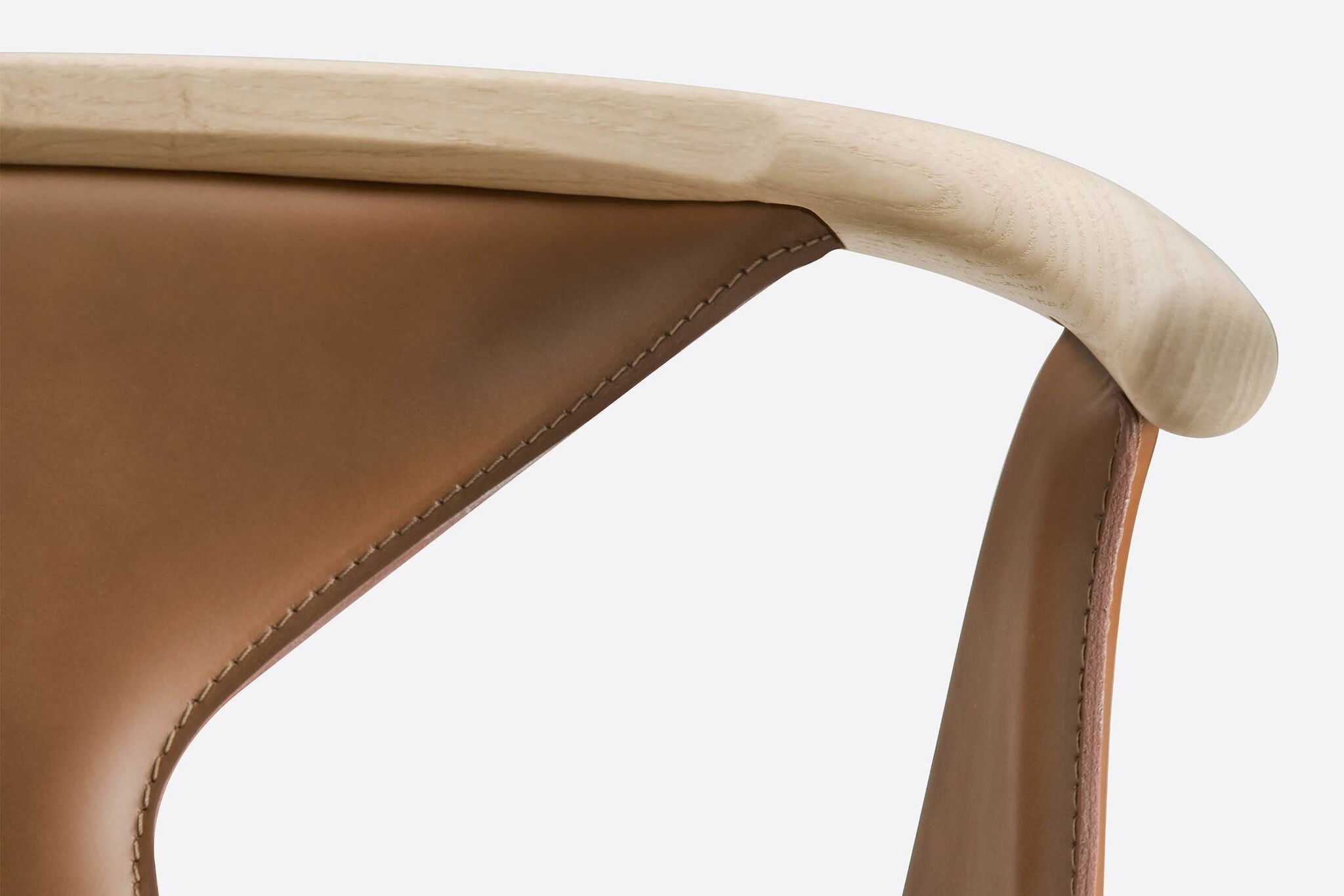 Een dunne met glasvezel versterkte polypropyleen schaal met lederen bekleding met een frame van hout.