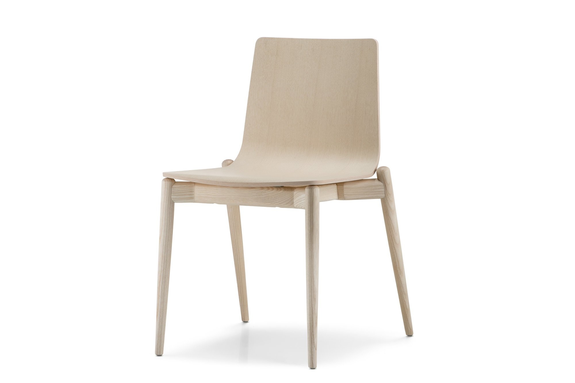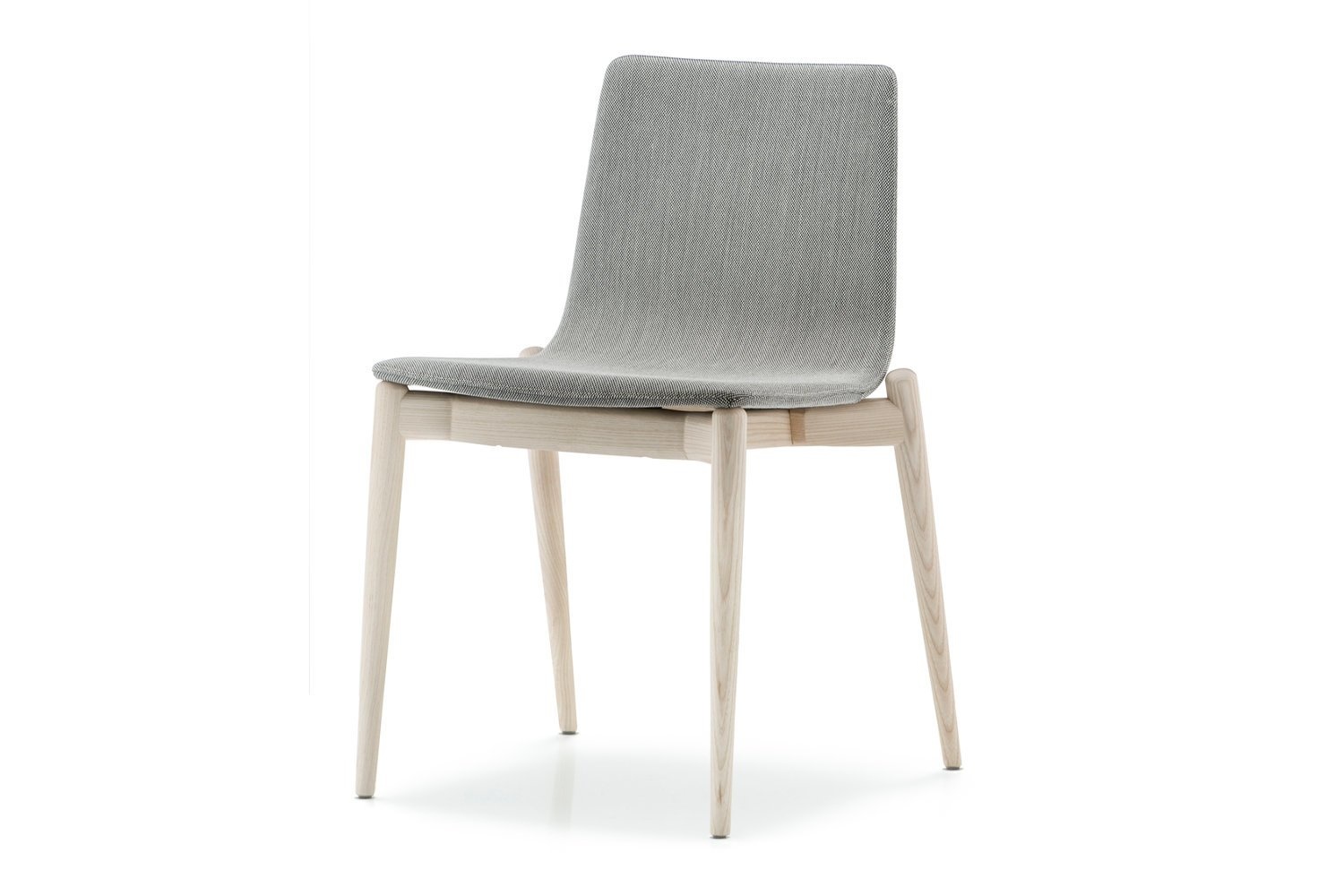 Deze essenhouten stoel is verkrijgbaar in de kleuren, zwart of lichtgrijs getint. De zitschaal is gestoffeerd.