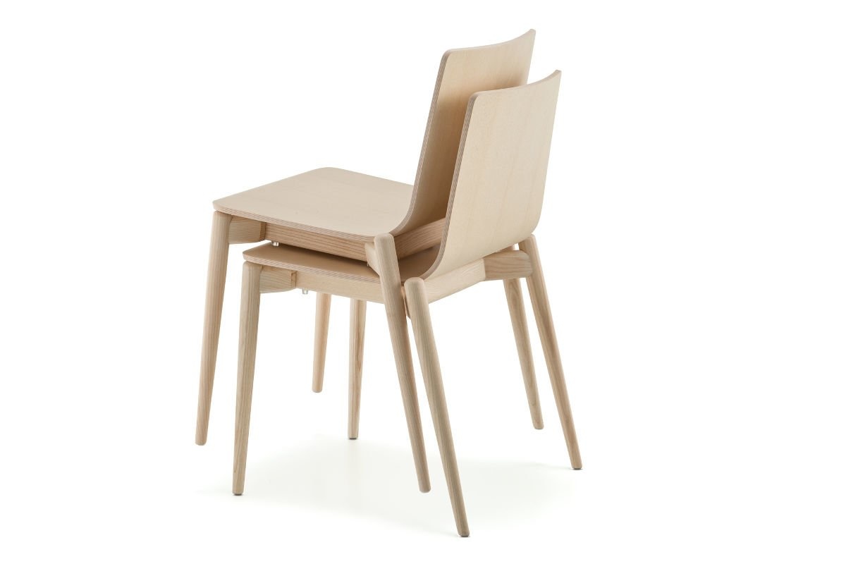 Deze essenhouten stoel is verkrijgbaar in de kleuren, zwart of lichtgrijs getint. De zitschaal is van multiplex. De stoelen zijn stapelbaar.