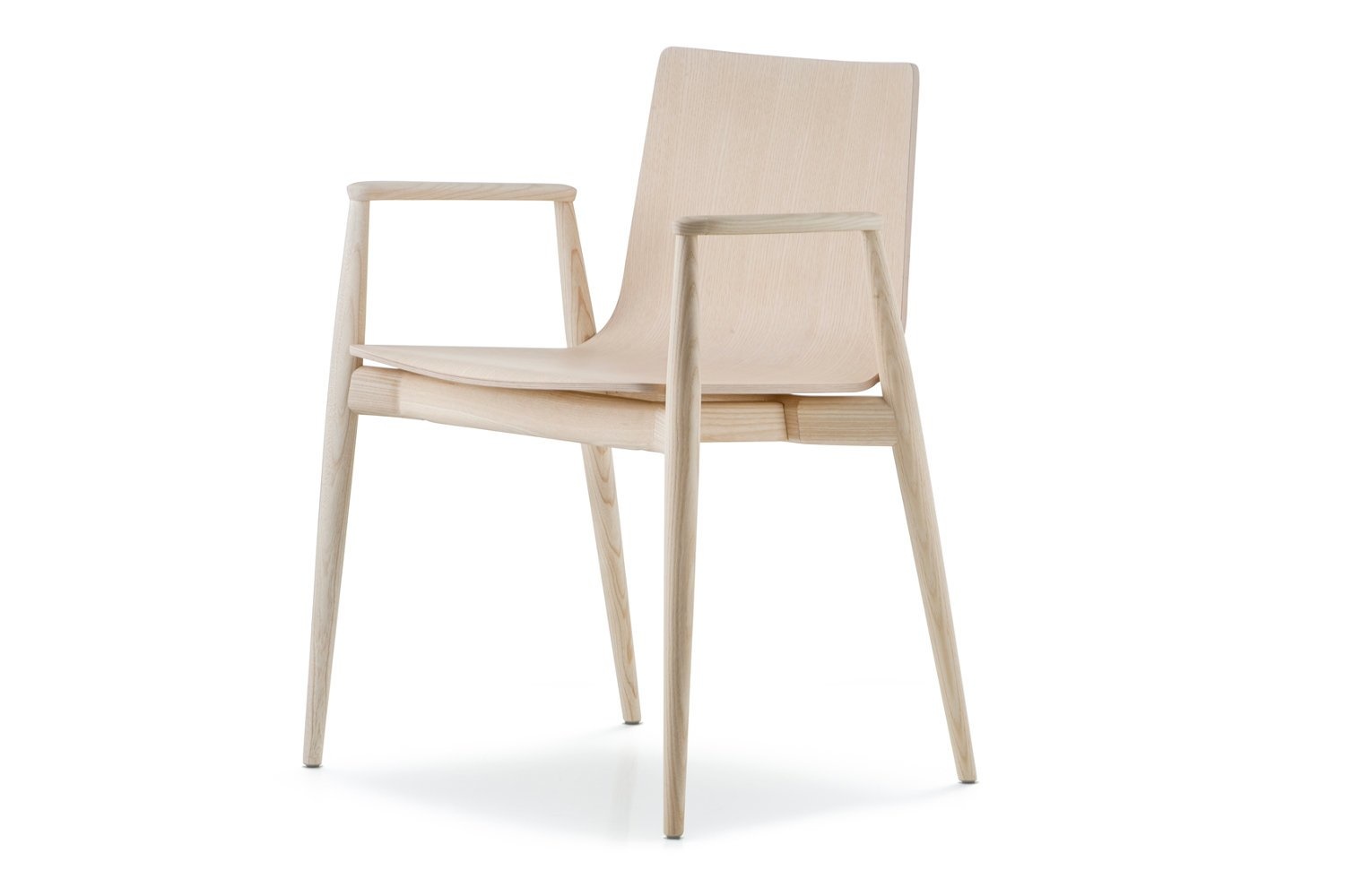 Deze essenhouten stoel met armleuningen is verkrijgbaar in de kleuren, zwart of lichtgrijs getint. De zitschaal is van multiplex.
