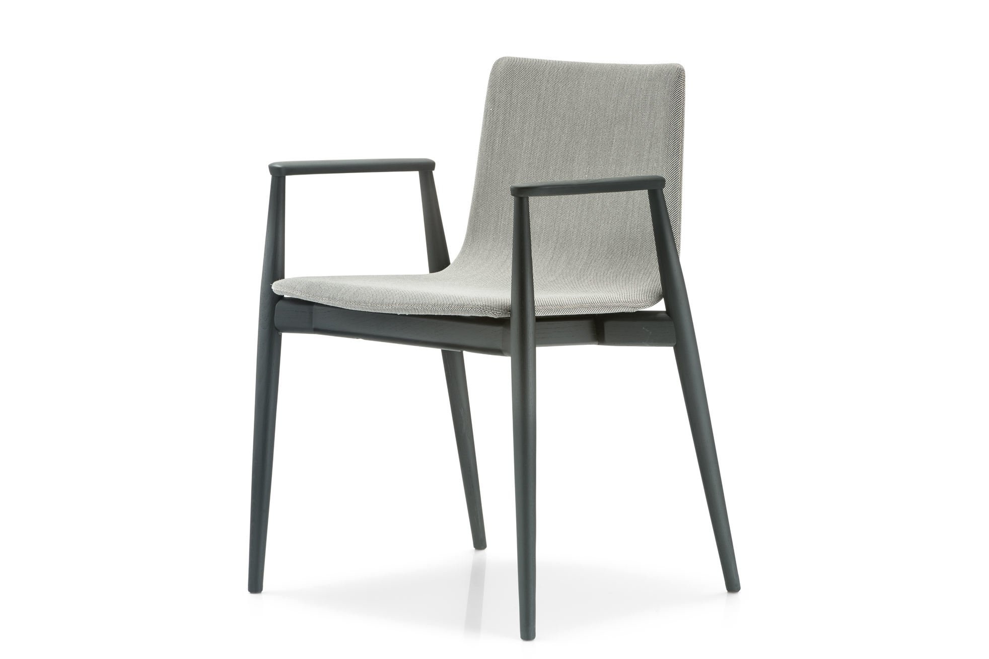 Deze essenhouten stoel met armleuningen is verkrijgbaar in de kleuren, zwart of lichtgrijs getint. De zitschaal is gestoffeerd.