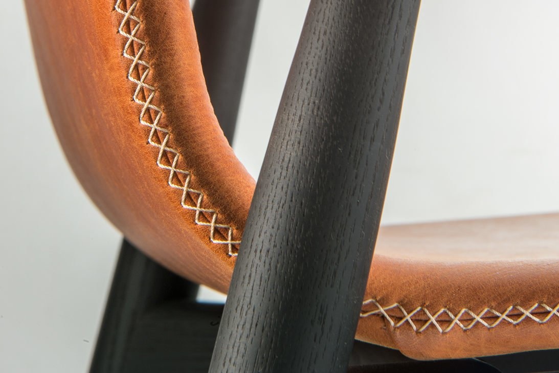 Deze essenhouten stoel is verkrijgbaar in de kleuren, zwart of lichtgrijs getint. De zitschaal is bekleedt met echt leer.
