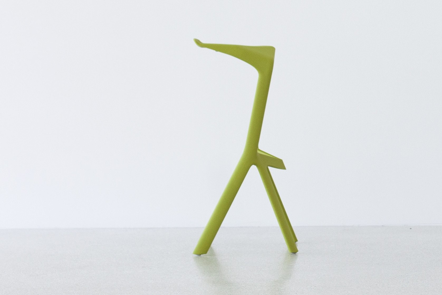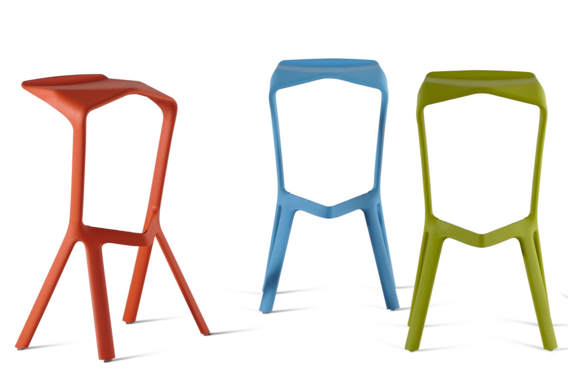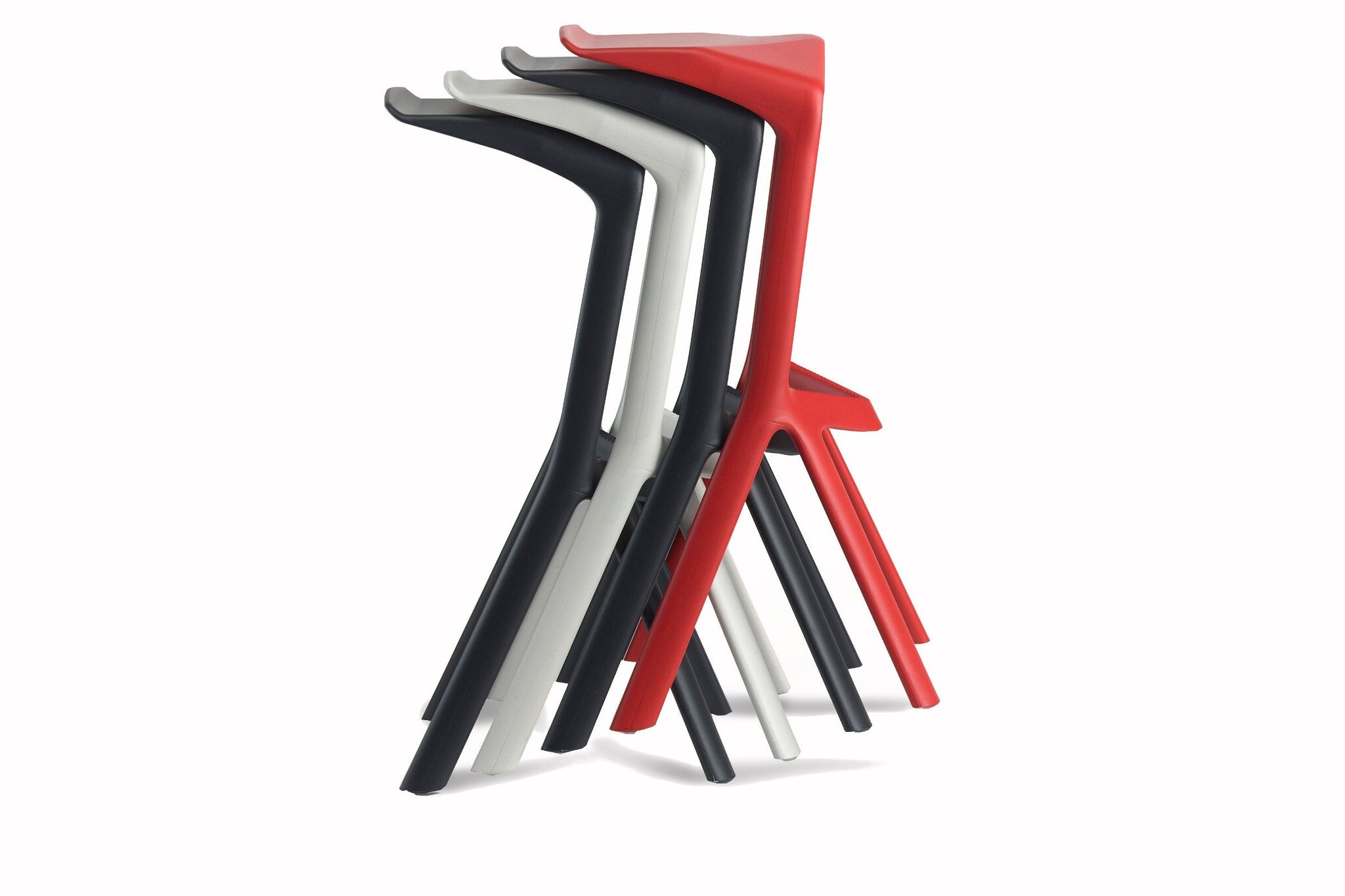 Stapelbaar barkruk uit verstevigd polypropyleen. Leverbaar in de kleuren: zwart, wit-grijs, signaal-rood, oranje, curry-geel, oxid-rood, kobaltblauw. Recyclebaar. De Plank Miura tafel collectie is nu ook leverbaar met een gepolijst aluminium basis.
