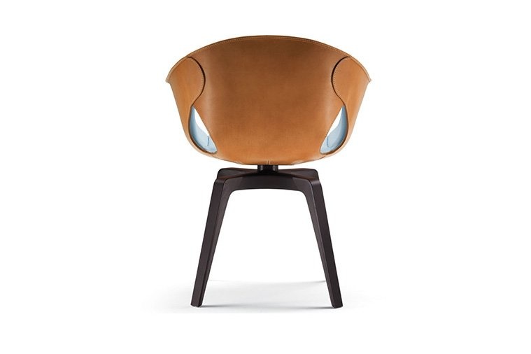 De Poltrona Frau Ginger stoelen hebben mooie details zoals de zichtbare stiksels die langs de buitenrand lopen, wat een stijlvol en elegant effect geeft. De zitting is opgevuld met polyurethaanschuim. Het onderstel heeft vier poten in wengé gekleurd massief essenhout met een driehoekig profiel. De steun voor het bevestigen van het frame is in zwart gelakt staal en de draaibare model zorgt voor een 360 graden rotatie.