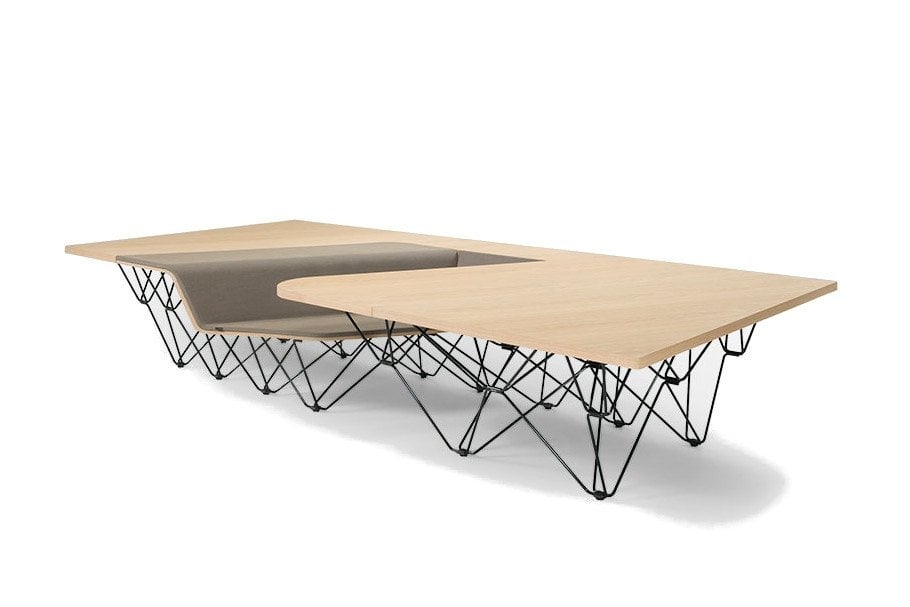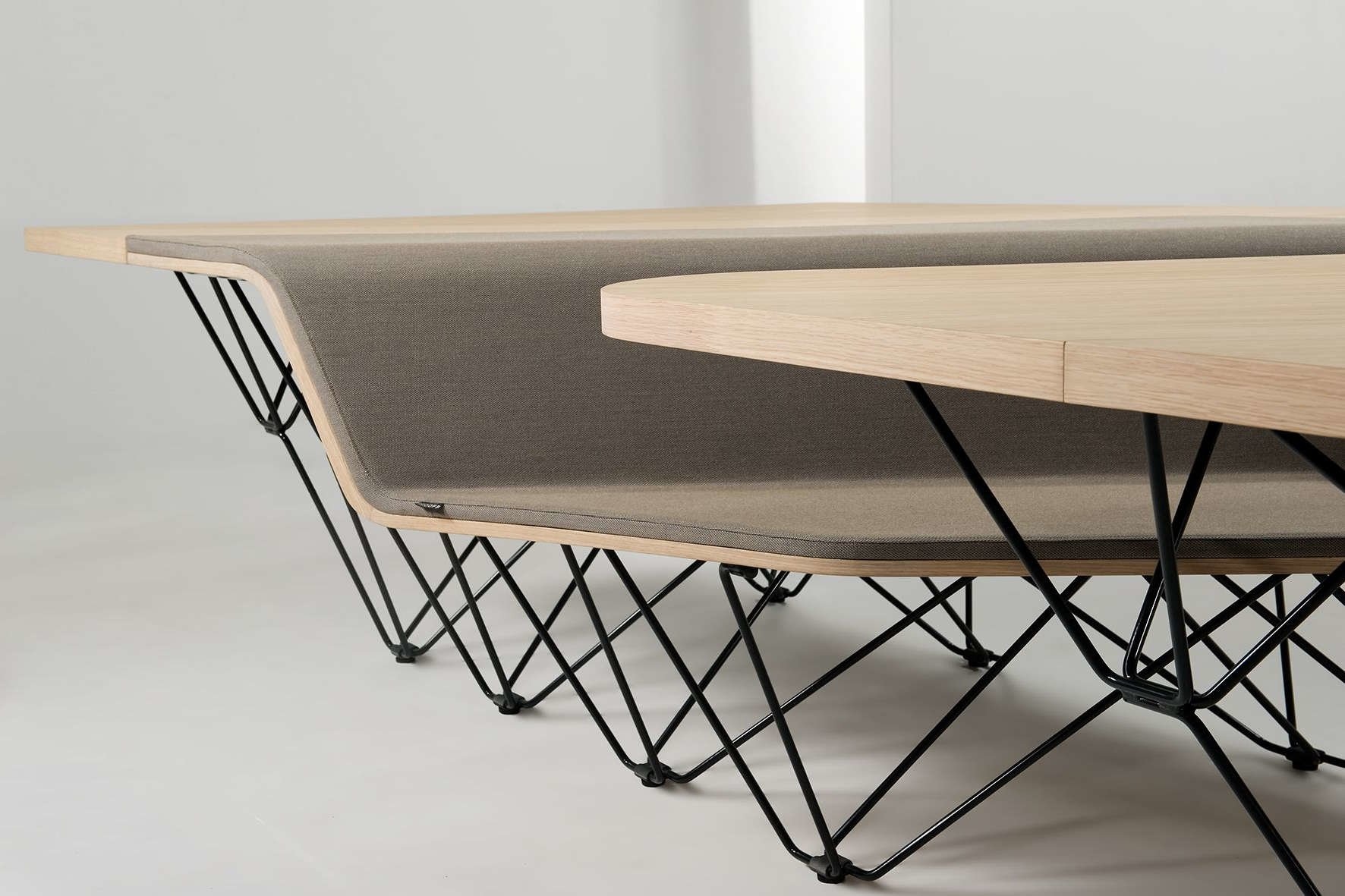 De SitTable bestaat uit een houten tafelblad, metalen frame, schuim voor de zitting van de bank.