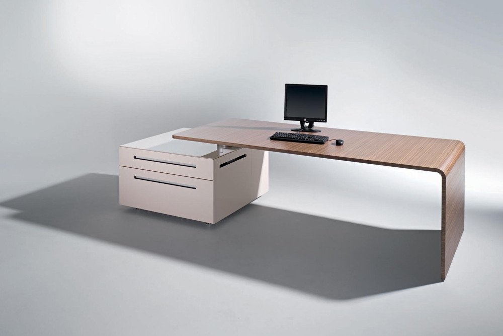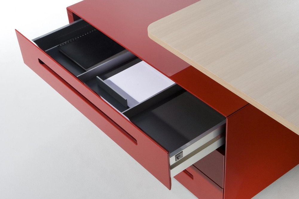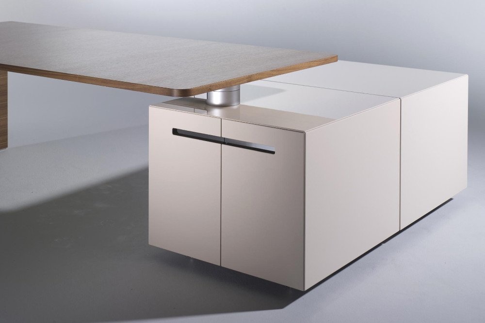 Een tafelprogramma en een modulair containersysteem met intelligente functies. Achter een deur met PC beugel en printerlade laten zich de technische onderdelen zinvol onderbrengen. De containers worden in verschillende hoogglans als ook matglans kleuren aangeboden. Ze kunnen individueel gecombineerd worden. De hoogwaardige fineerafwerkingen van Ahorn tot Zebrano donker gebeitst laten een bijzonder contrast zien. De containers worden in verschillende hoogglans als ook matglans kleuren aangeboden. Ze kunnen individueel gecombineerd worden. De hoogwaardige fineerafwerkingen van Ahorn tot Zebrano donker gebeitst laten een bijzonder contrast zien.