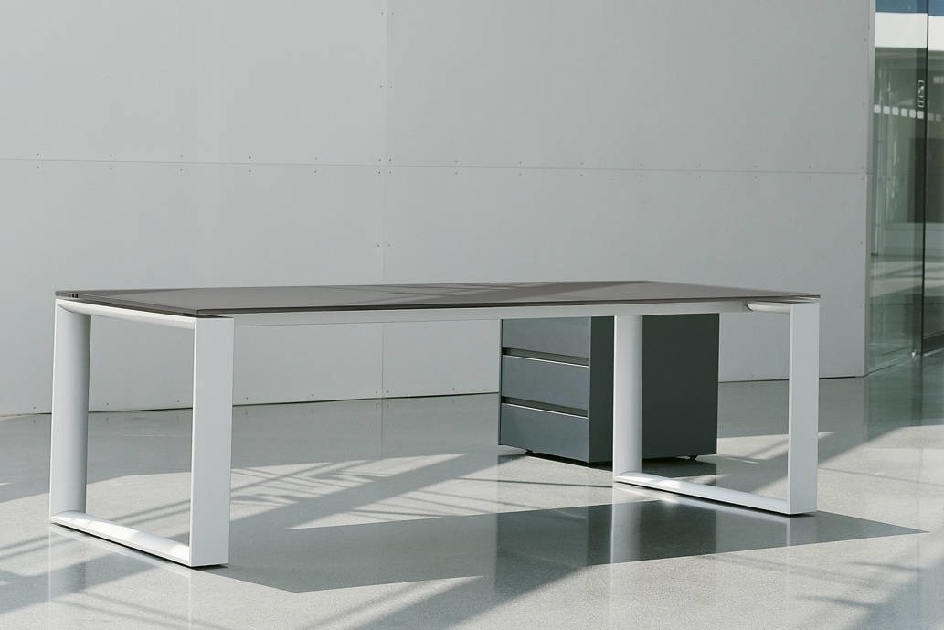 Rechthoekige frames uit aluminium geven de toon aan. Het bureaublad lijkt over het frame te zweven en geeft op deze manier lichtvoetigheid en transparantie aan. Door deze details staan de hoogwaardige materialen in de voorgrond. Een exclusieve verschuifbare lederinlay verdekt vakken die dan in tafelblad geintegreerd zijn. Afleg voor accessoires en aansluitingen voor stroom/data-telefonie behoren dan tot de mogelijkheden van Renz Sono.