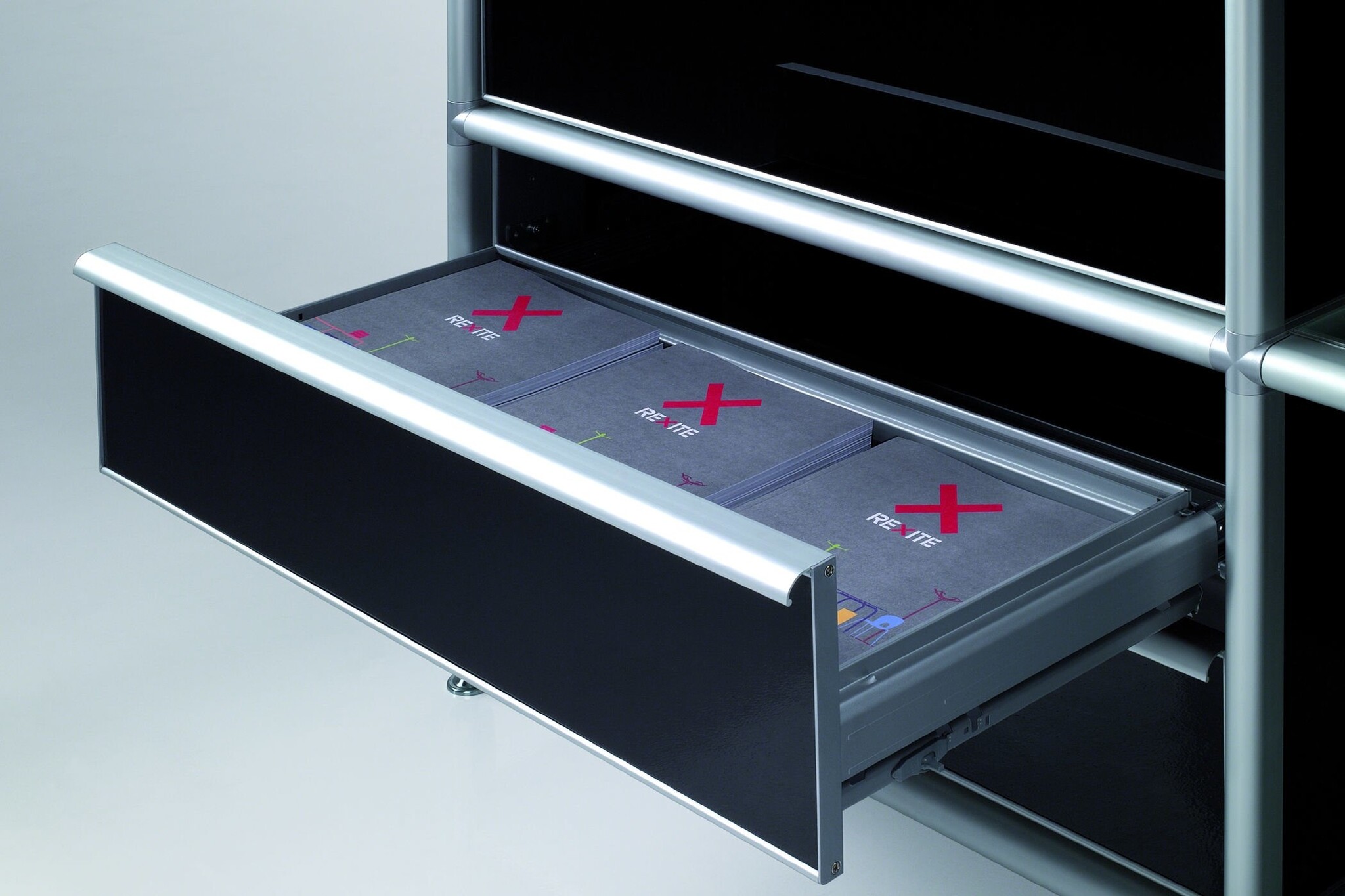 De Rexite Boox is een modulair kastensysteem. De basis is een stellingsysteem met gepolijst of geanodiseerd aluminium frame, methacrylaat panelen in wit of kristal met geharde glas planken in transparant, mat of wit. Het systeem vrij te combineren, zowel in hoogte en breedte met een maximale hoogte van 229 cm. Door te combineren met hoogte, aantal planken en kleur is er altijd een Rexite Boox die past in uw kantoorinterieur.Rexite en het milieu