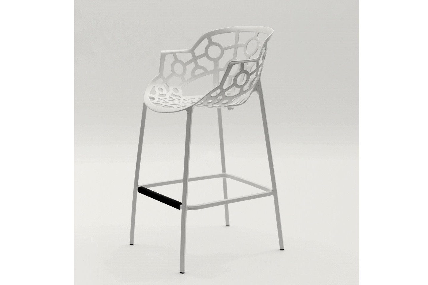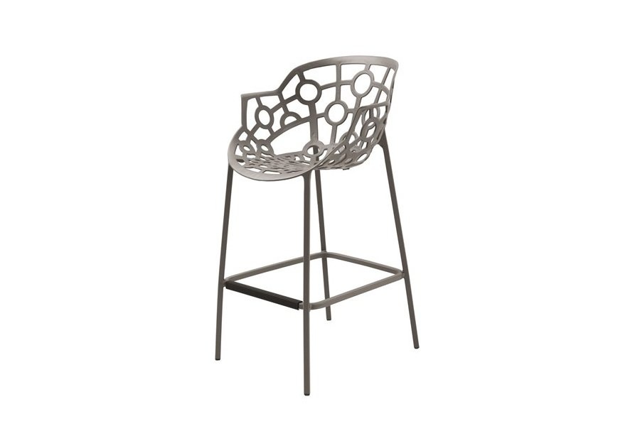 Segis Polo is ook beschikbaar als barkruk met een zithoogte van 75 cm. De barkruk is net als de Polo stoel geschikt voor zowel binnen- als buitengebruik en heeft hetzelfde sierlijke geometrische en open patroon. Voor comfortabel zitten is de kruk voorzien van een steun voor de voeten waar de gebruiker zijn of haar voeten op kan laten rusten. Het is vervaardigd van sterk recyclebaar thermo-plastic. Segis Polo barkruk, de kenmerken