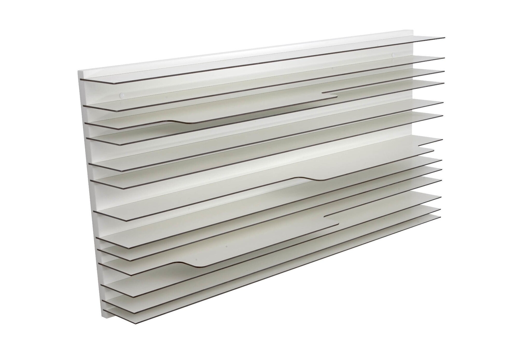 Per wandplaat worden 13 losse volkern legplanken 120x15 cm of 60x15 cm geleverd met een dikte van 4 mm, die vervolgens in de sleuven geschoven worden.