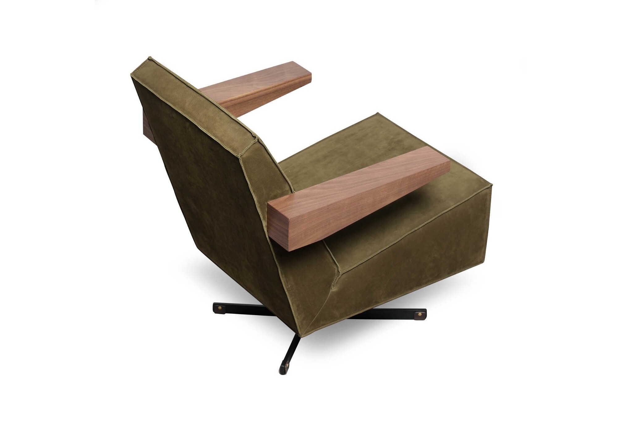 De Press Room Chair is leverbaar in een gestoffeerde en een leren uitvoering. De bijzondere afwerking van de stiknaden accentueert de strakke, heldere vlakverdeling van de fauteuil, die bovendien in de brede, houten armleggers terug komt.