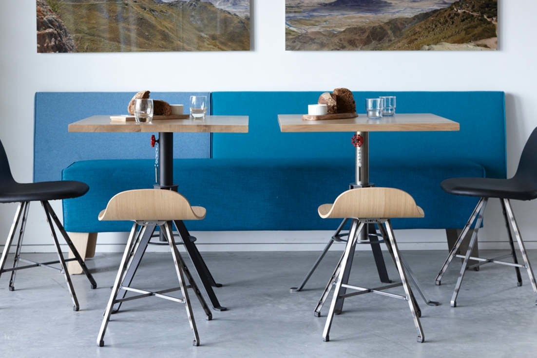 Het onderstel is van blank staal, eik fineer of eik massief hout.