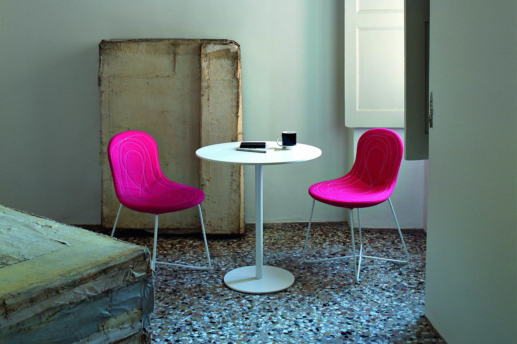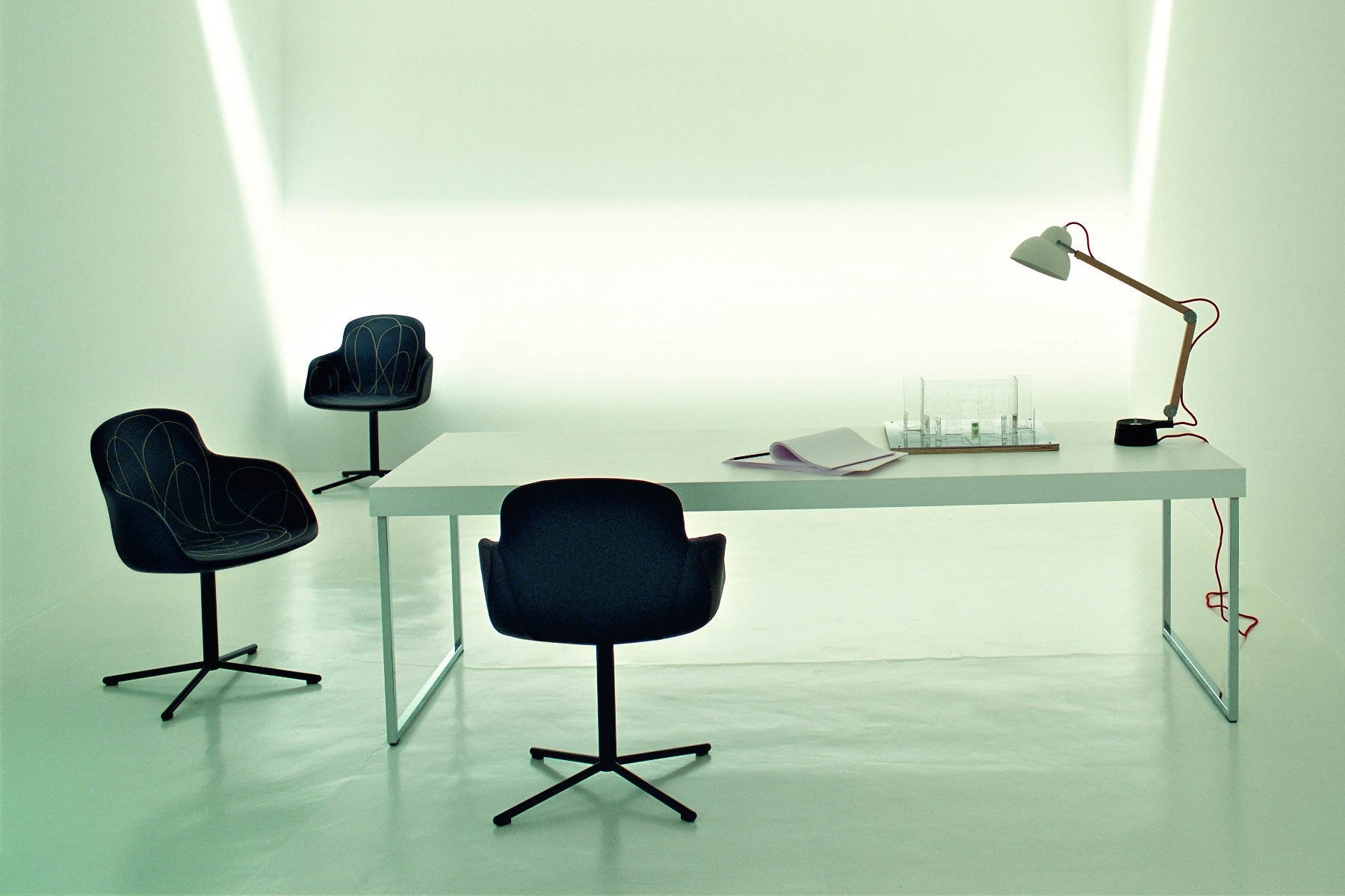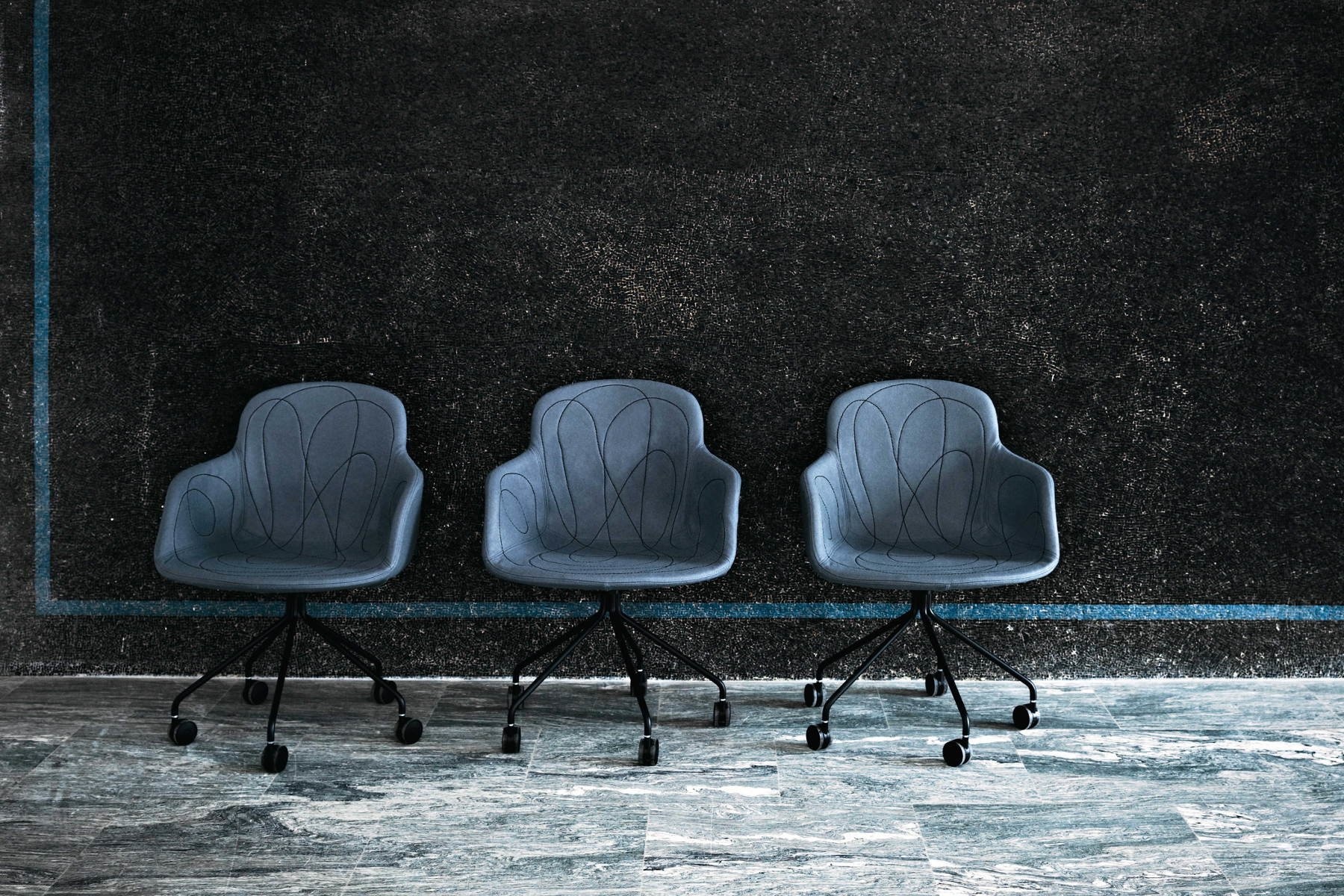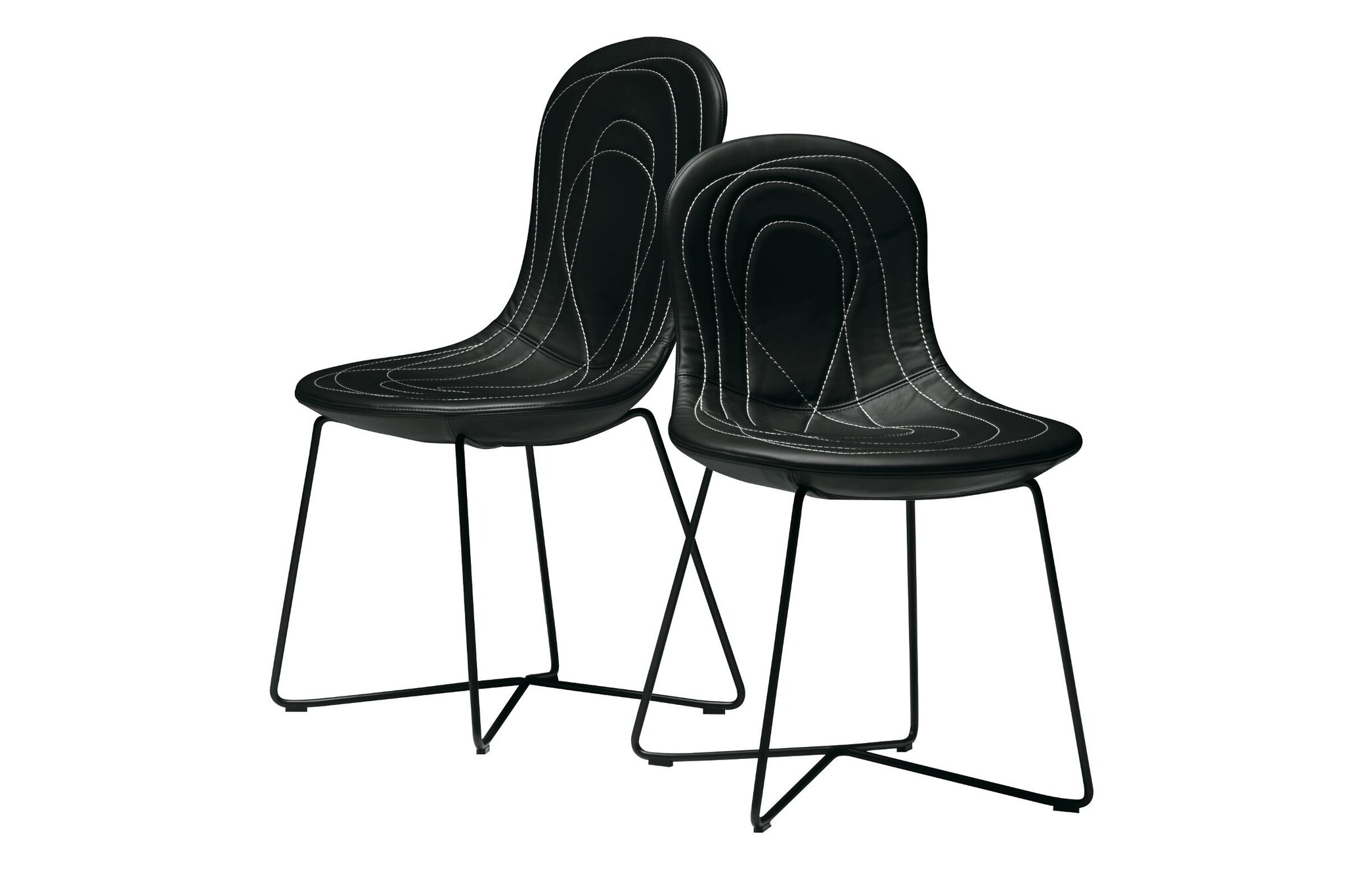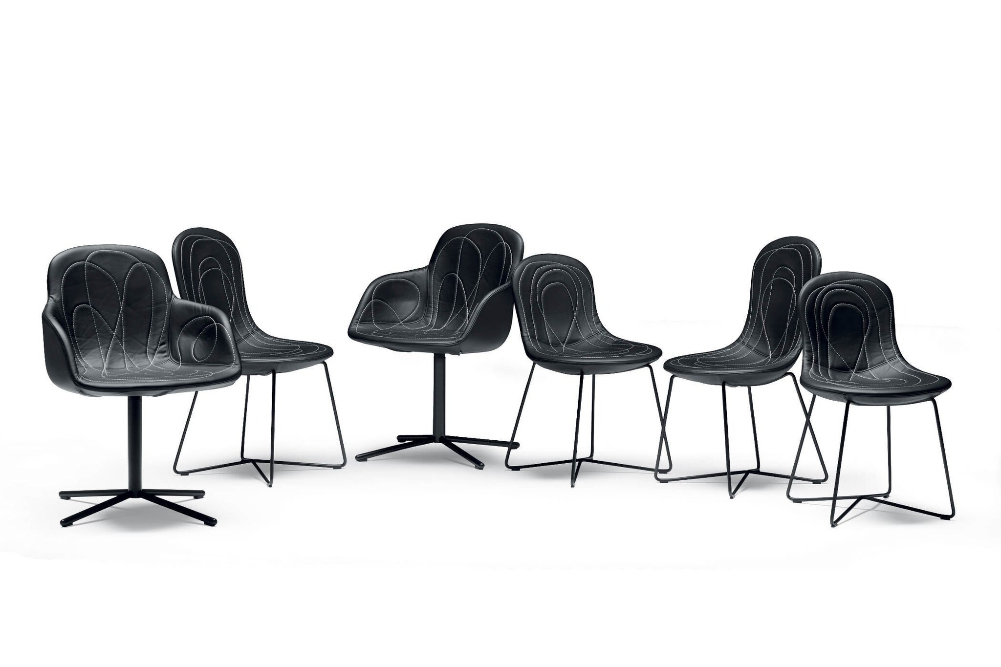 Doodles, tekeningen we onbewust maken terwijl we aan het telefoneren zijn of met onze gedachten afdwalen. Lijnen, spiralen en wervelingen die altijd verschillend zijn. Dit is de inspiratie achter het ontwerp concept van deze serie stoelen. De zichtbare lijnen van Doodle zijn gestikt op de stof of leer in contrasterende of bijpassende kleuren.