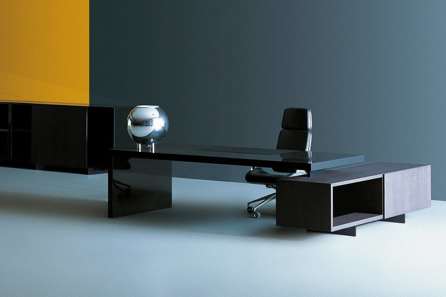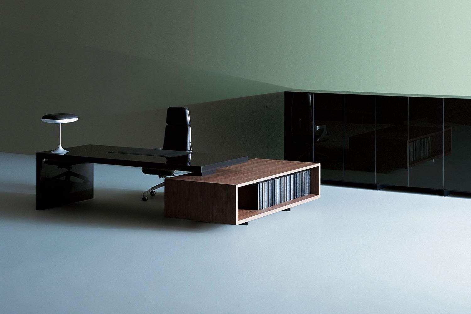 De werkbladen van de bureaus kunnen worden afgewerkt in matte of glanzende witte en donkergrijze lak of in lichte, of donkere eiken, grijze en donkerbruine lak.