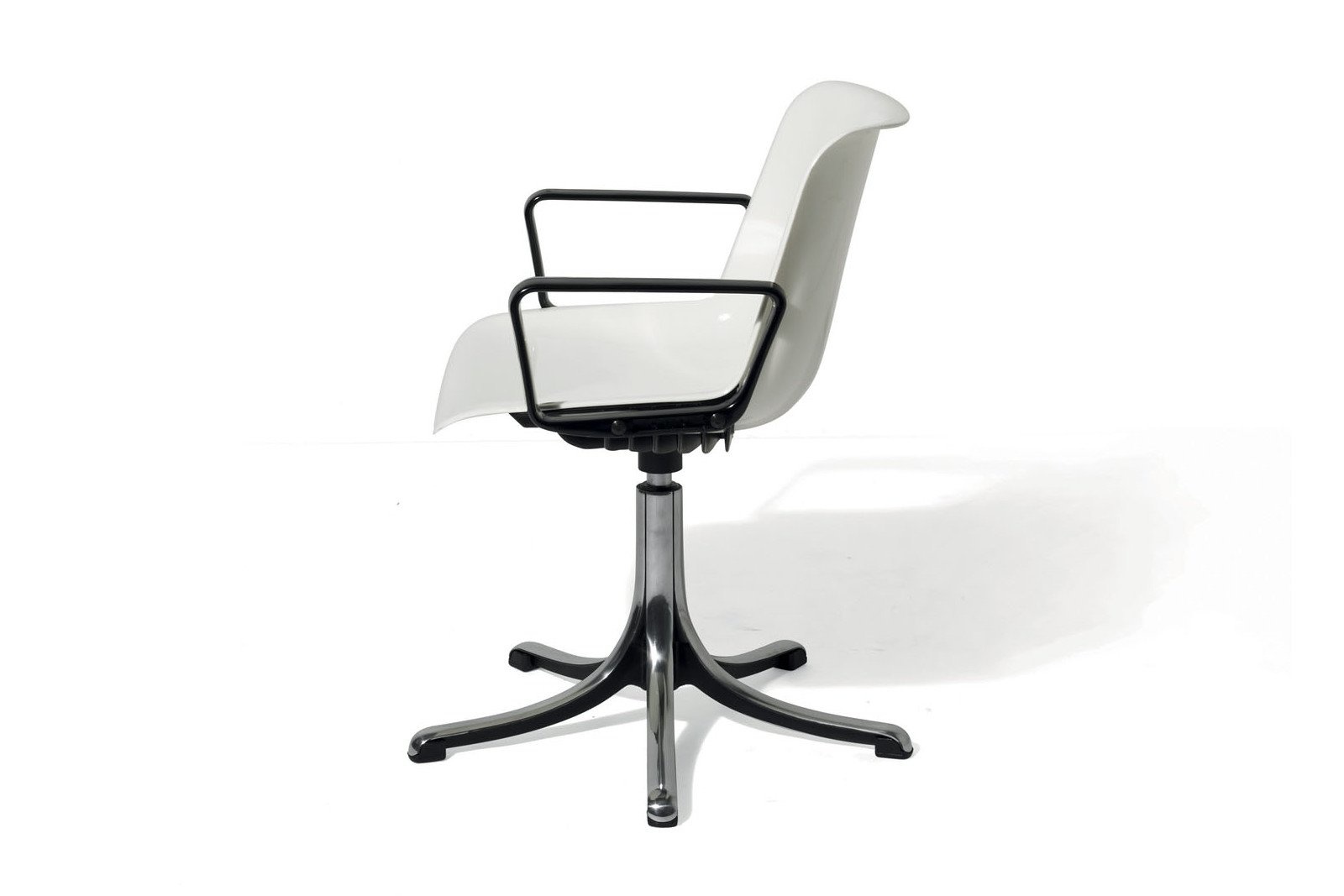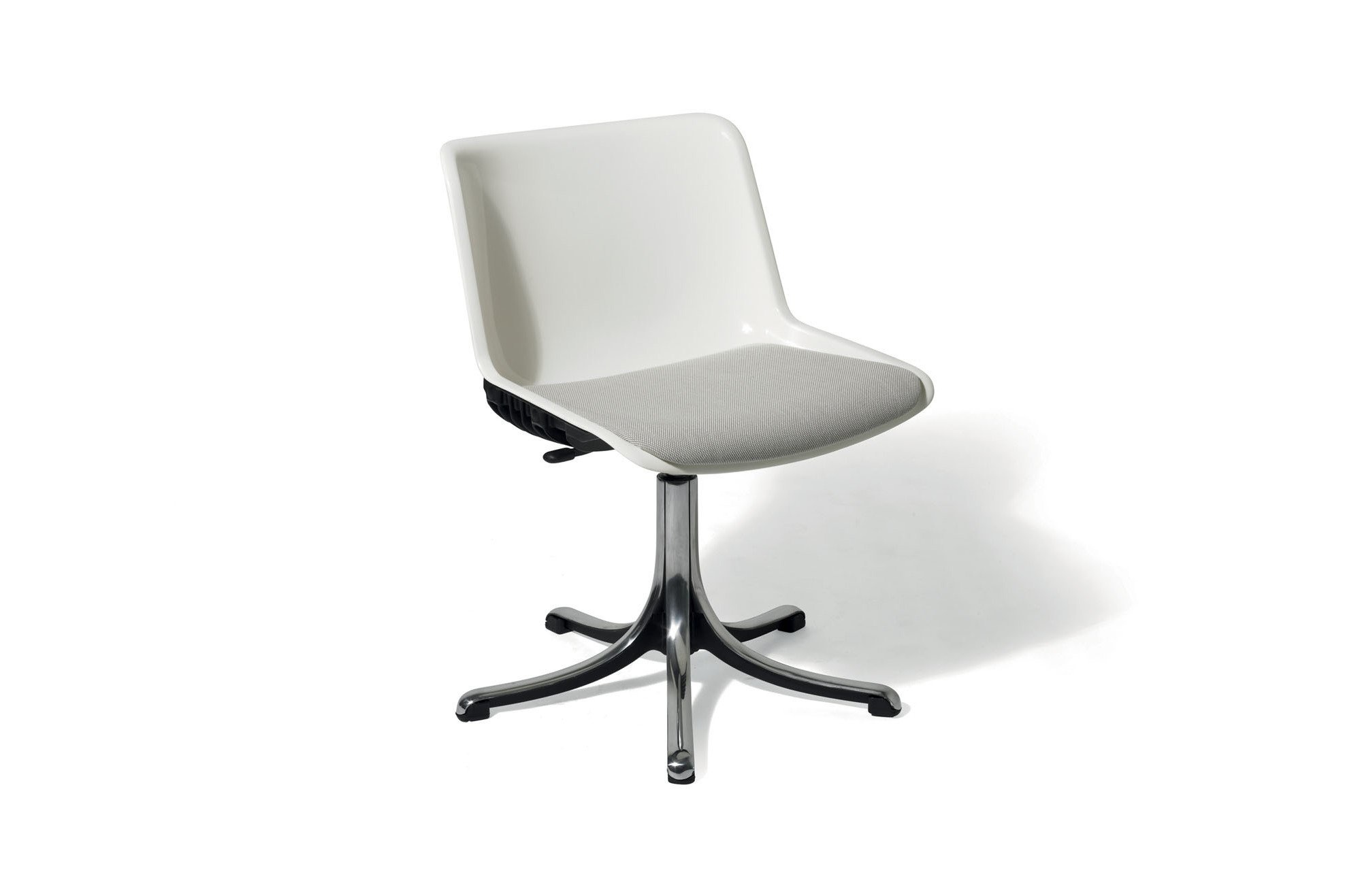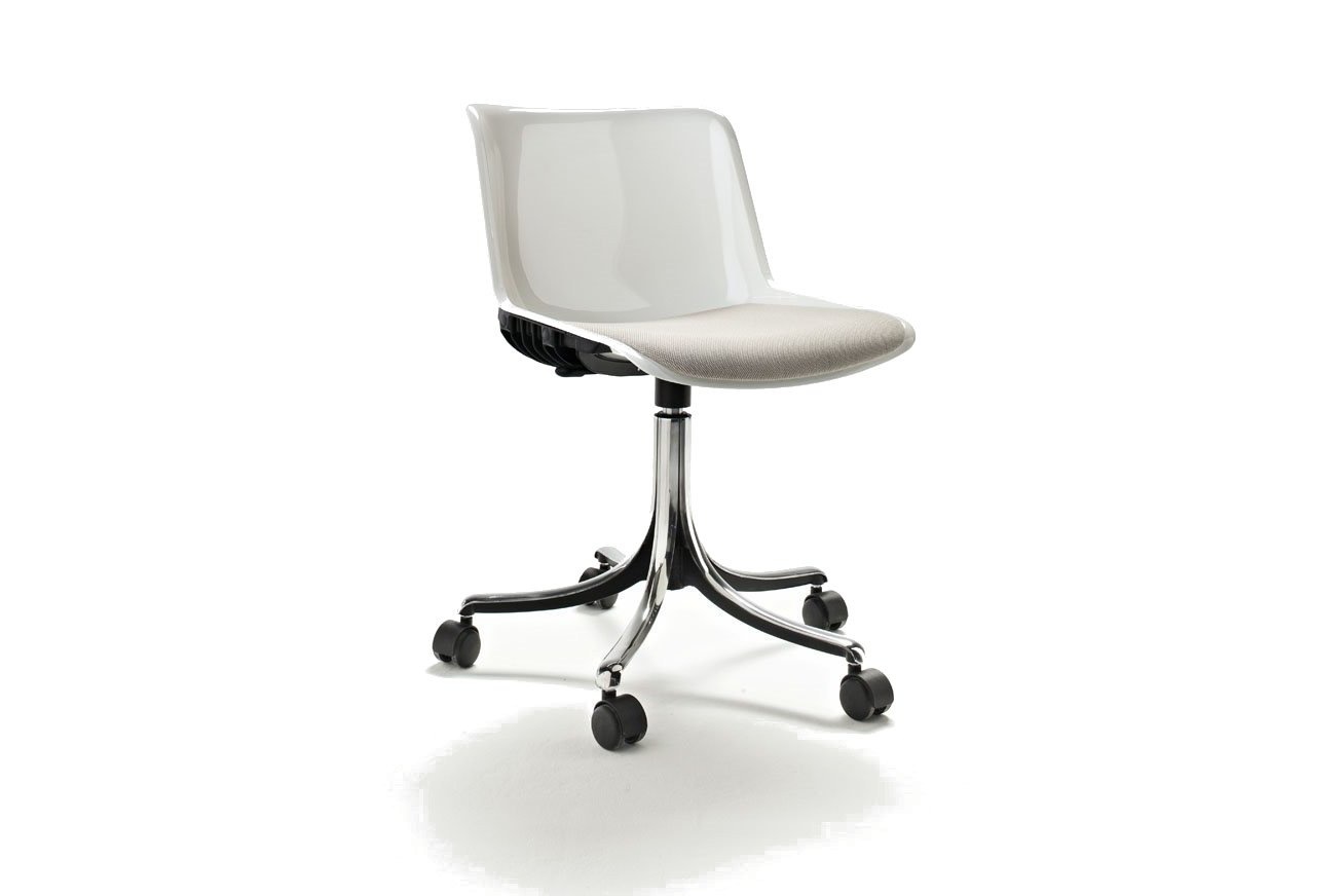 als draaibare stoel op een 5-ster met een basis in gepolijst gegoten aluminium en optioneel uitgerust met gewatteerde bekleding, armleuningen, hoogteverstelling, met poten of op wielen.