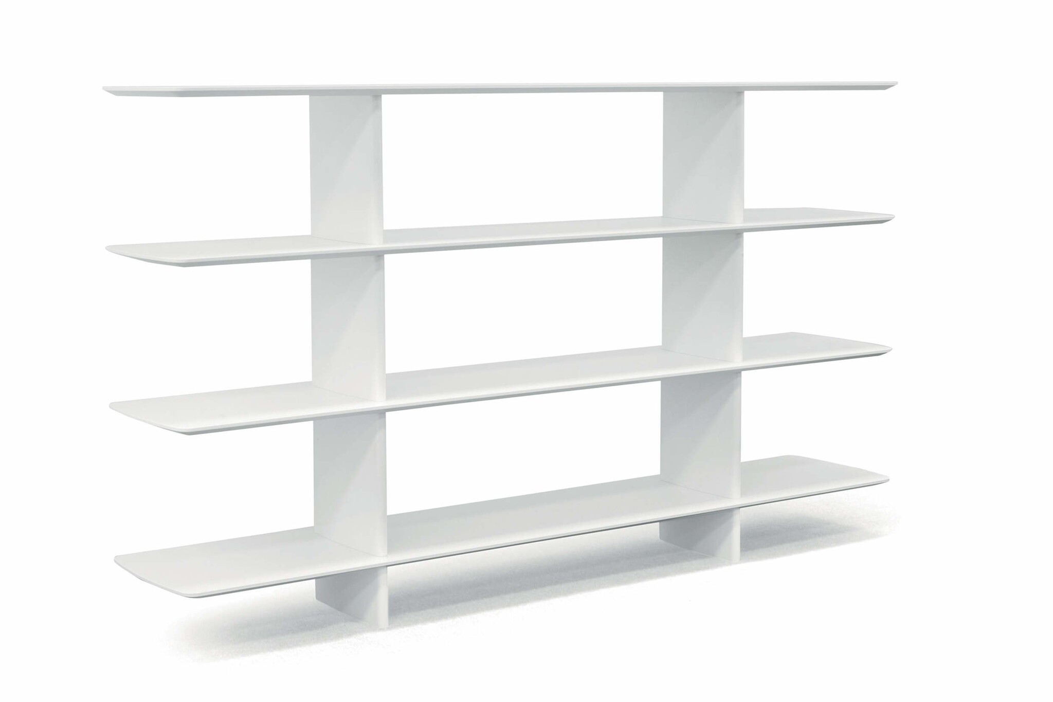 De Tecno Shift boekenkast met de afmetingen 240 x 45 cm en de hoogten 99 of 139 cm heeft de slanke, afgeronde vormen van de tafel en komt in twee uitvoeringen met 3 of 4 schappen. De structuur van de boekenkast is in aluminium met een matte witte verf afwerking.
