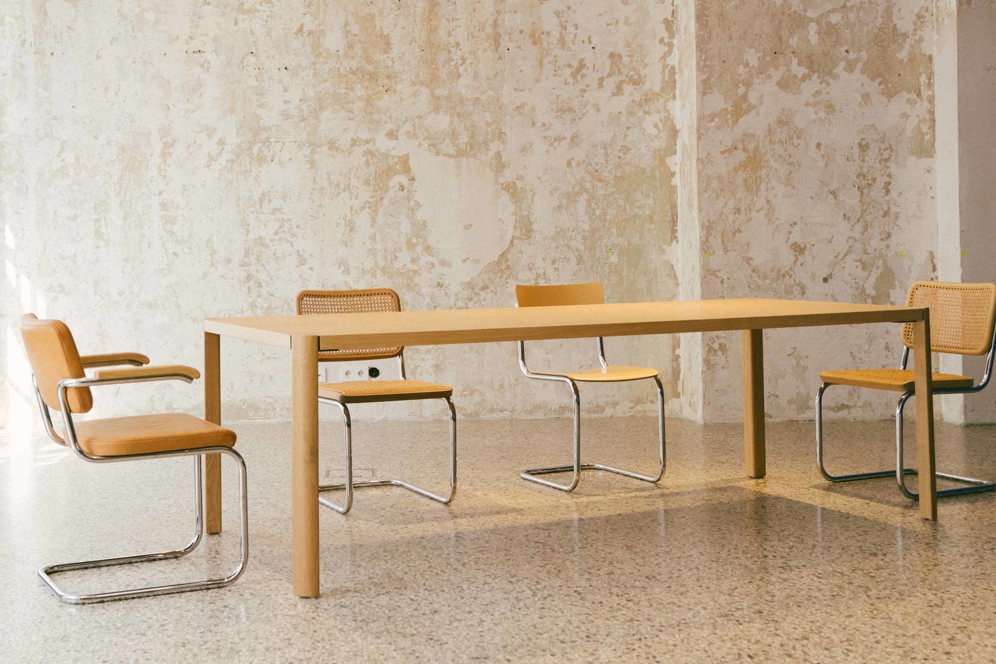 De Thonet 1140 is een fraaie tafel van eikenhout met afgeronde hoeken en multi-inzetbaar. Dankzij de slimme constructie van het frame zijn stoelen met armleuningen ook onder de uiterst robuuste en stabiele tafel te schuiven. Hierdoor is de Thonet 1140 tafel goed toe te passen als tijdelijke werkplek of als vergadertafel, aangezien vergaderstoelen vaak een armleuning hebben. Ook in de horeca past deze tafel die een warme uitstraling heeft. Kies uw formaat welke het beste bij uw inrichtingsconcept past. Uiteraard kan een expert van Tint Office u helpen bij het maken van de keuze. De zwarte of aluminium verbinders van de tafelpoten en het blad geven een speels effect in de tafel.