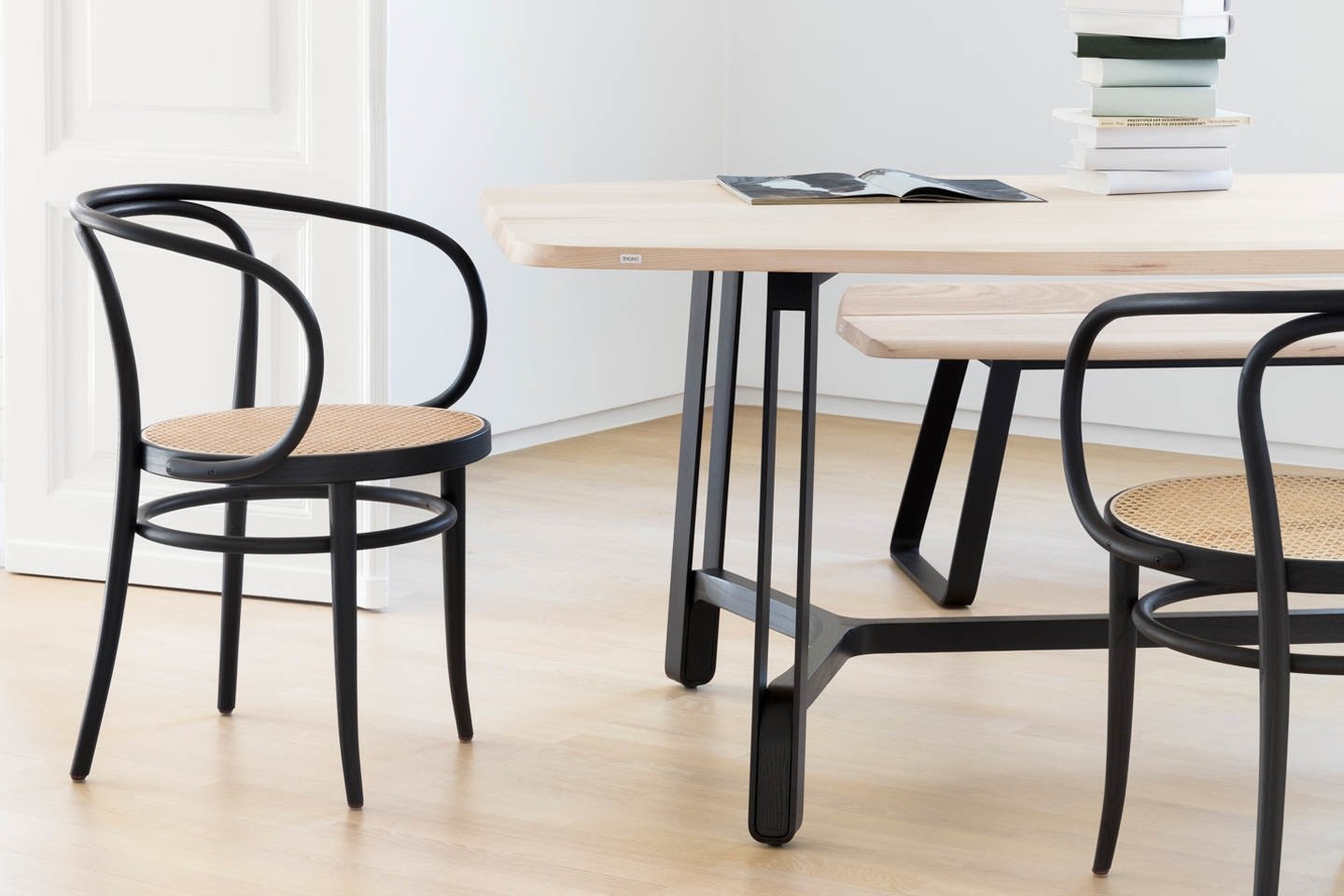 De Thonet 210 R is één van de klassiekers van Thonet, de rug- en armleuningen bestaan uit één stuk van gebogen massief beukenhout. De organische vormgeving geeft de stoel een prachtige esthetische uitstraling. Deze stoel is leverbaar met een open rugleuning of met een rugelement. De zitting en rugleuning zijn leverbaar in webbing of van multiplex wat bekleed is met stof of leer.