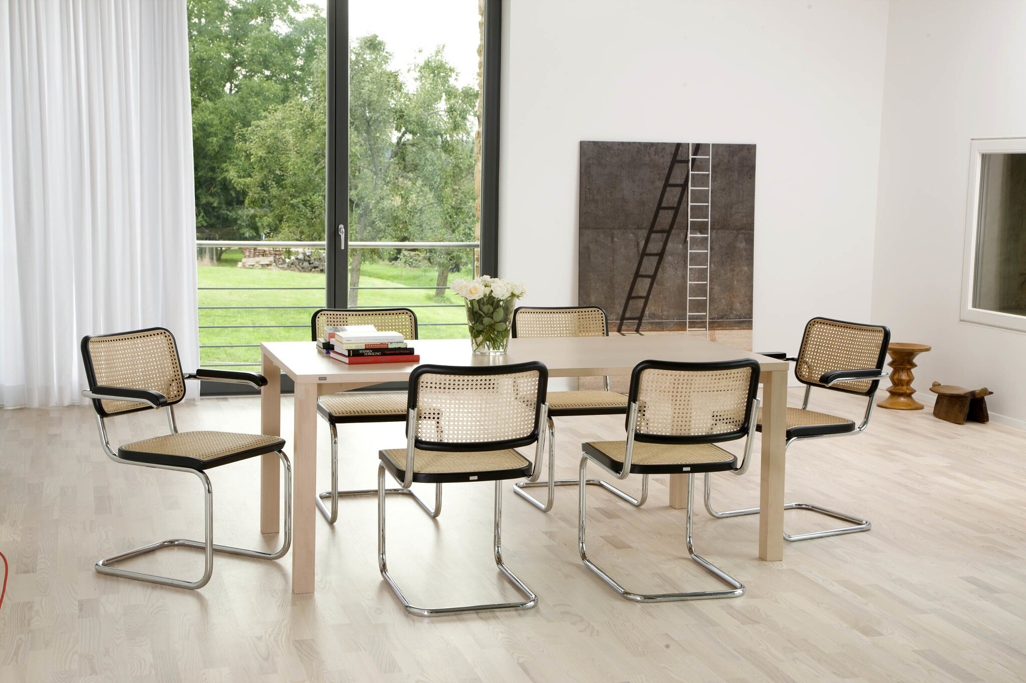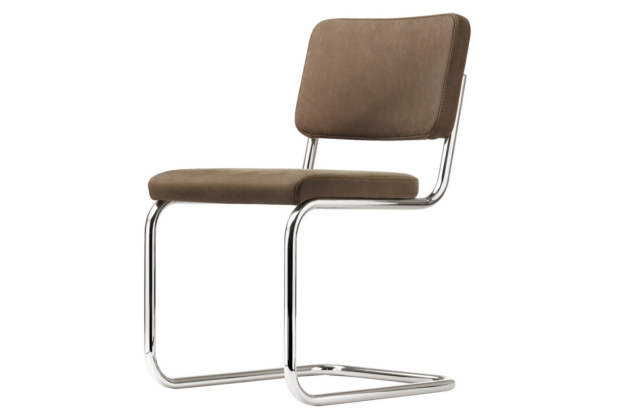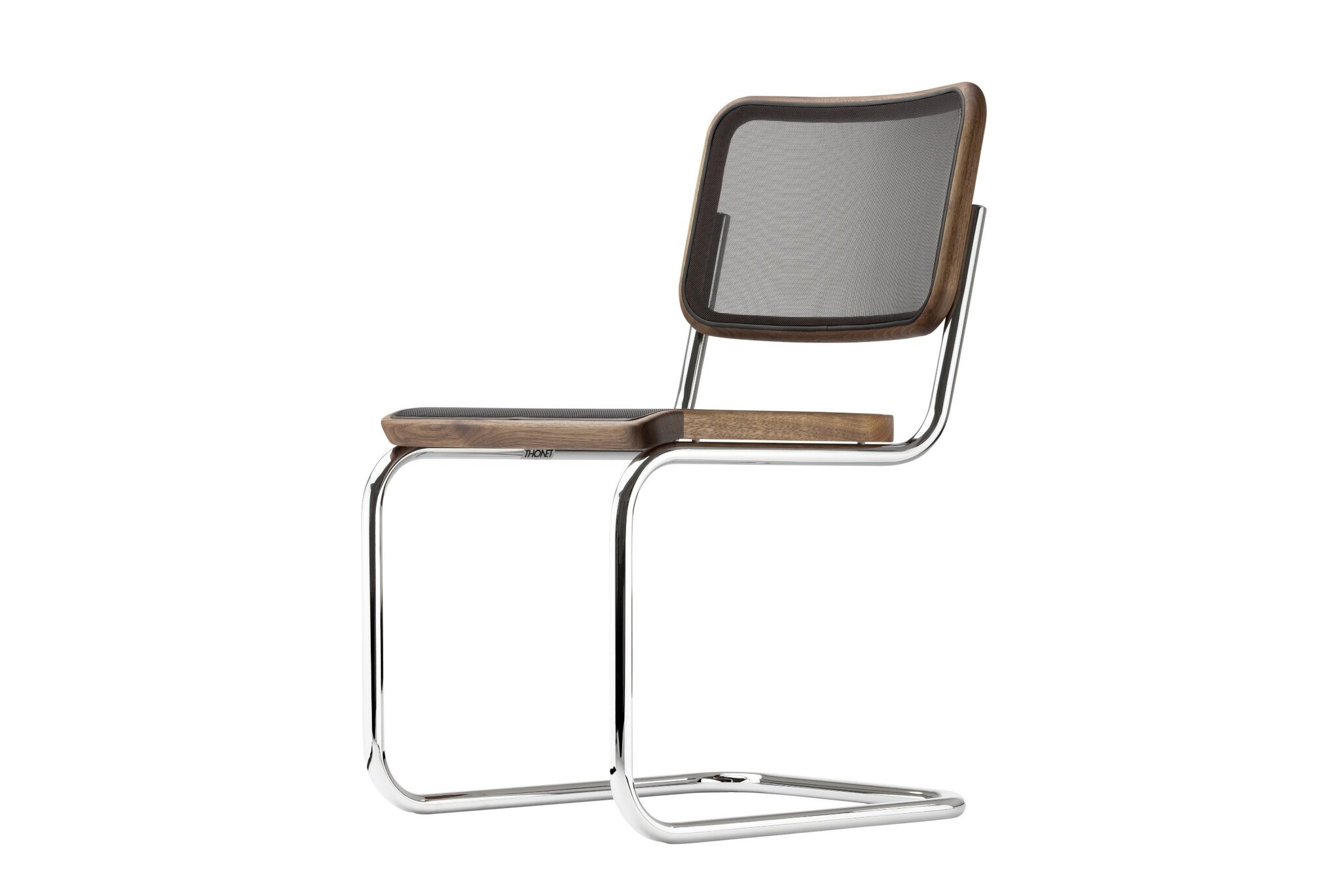 Thonet S32 stoel is een van de meest geproduceerde klassiekers van stalen buizen. De S32 stoel heeft een verchroomd stalen buizen sledeframe, houten accenten van gebeitst beuken en heeft geen armleuningen. De zitting en rugleuning bespannen met gevlochten riet, netwave of gepolsterd en met leder of stof overtrokken. Het gestoffeerde model is ook verkrijgbaar als Pure Materials uitvoering. Thonet S32 uitvoeringen;