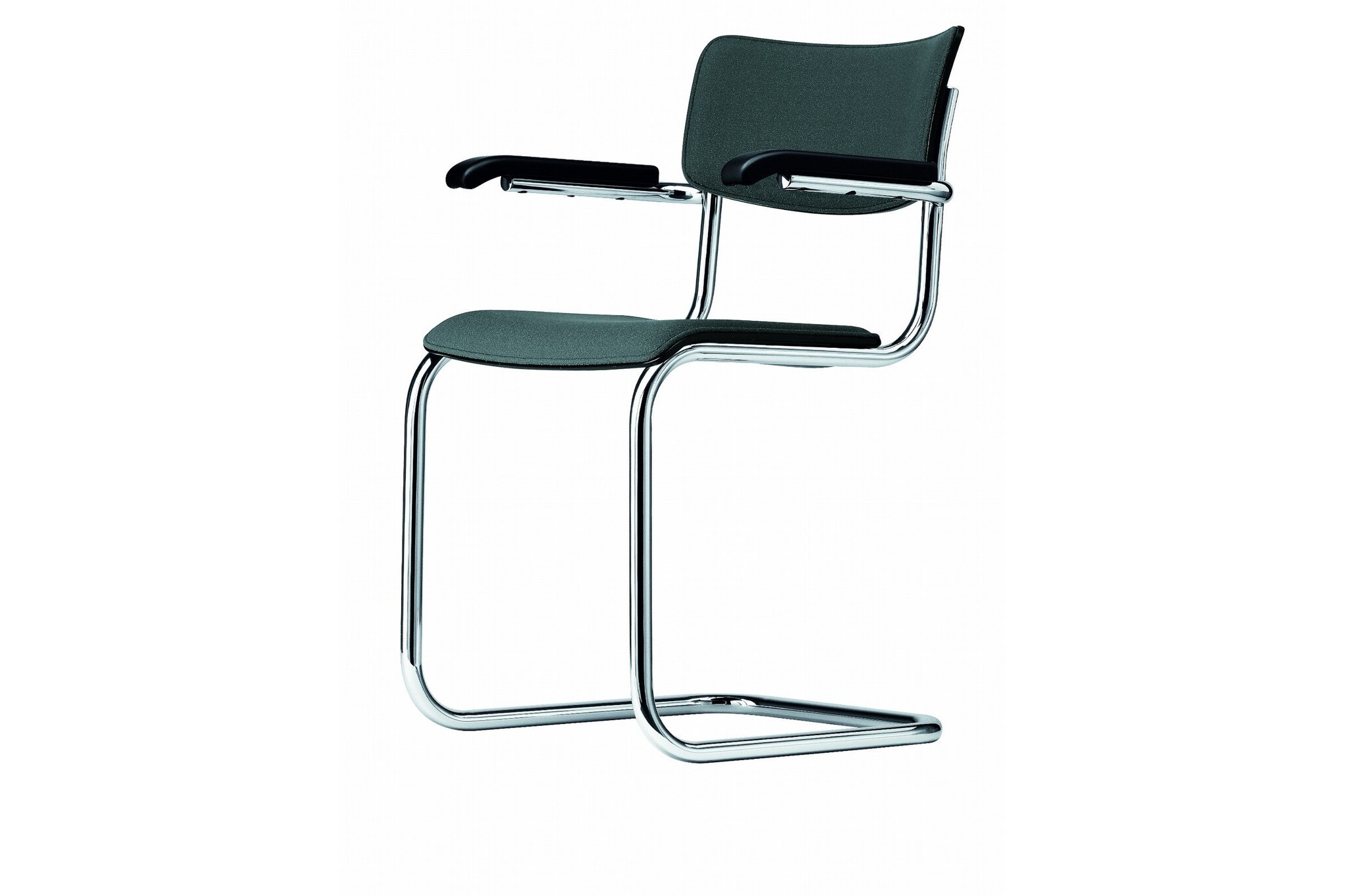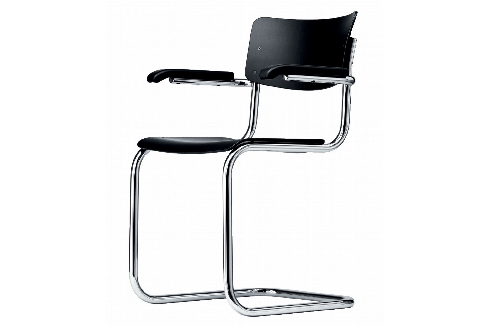 Thonet S43 F: zitschaal van voorgevormd multiplex, sledeframe en armleuningen.