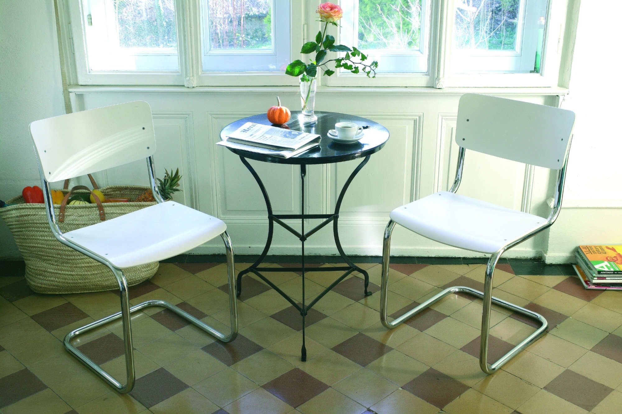 Thonet S43: zitschaal van voorgevormd multiplex en stalen sledeframe.